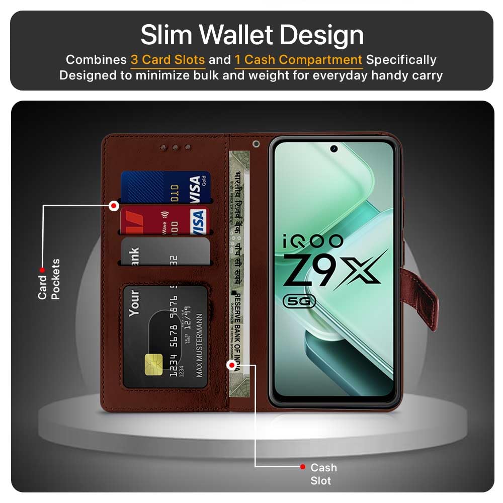 Shock Proof Flip Cover Back Case for Iqoo Z9X 5G | Magnetic Wallet Leather Case with Stand
