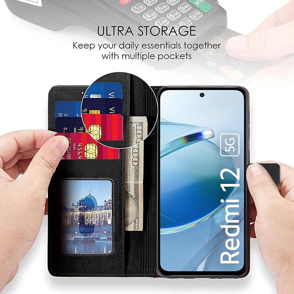 Shock Proof Flip Cover Back Case for Mi Redmi 12 5G | Magnetic Wallet Leather Case with Stand