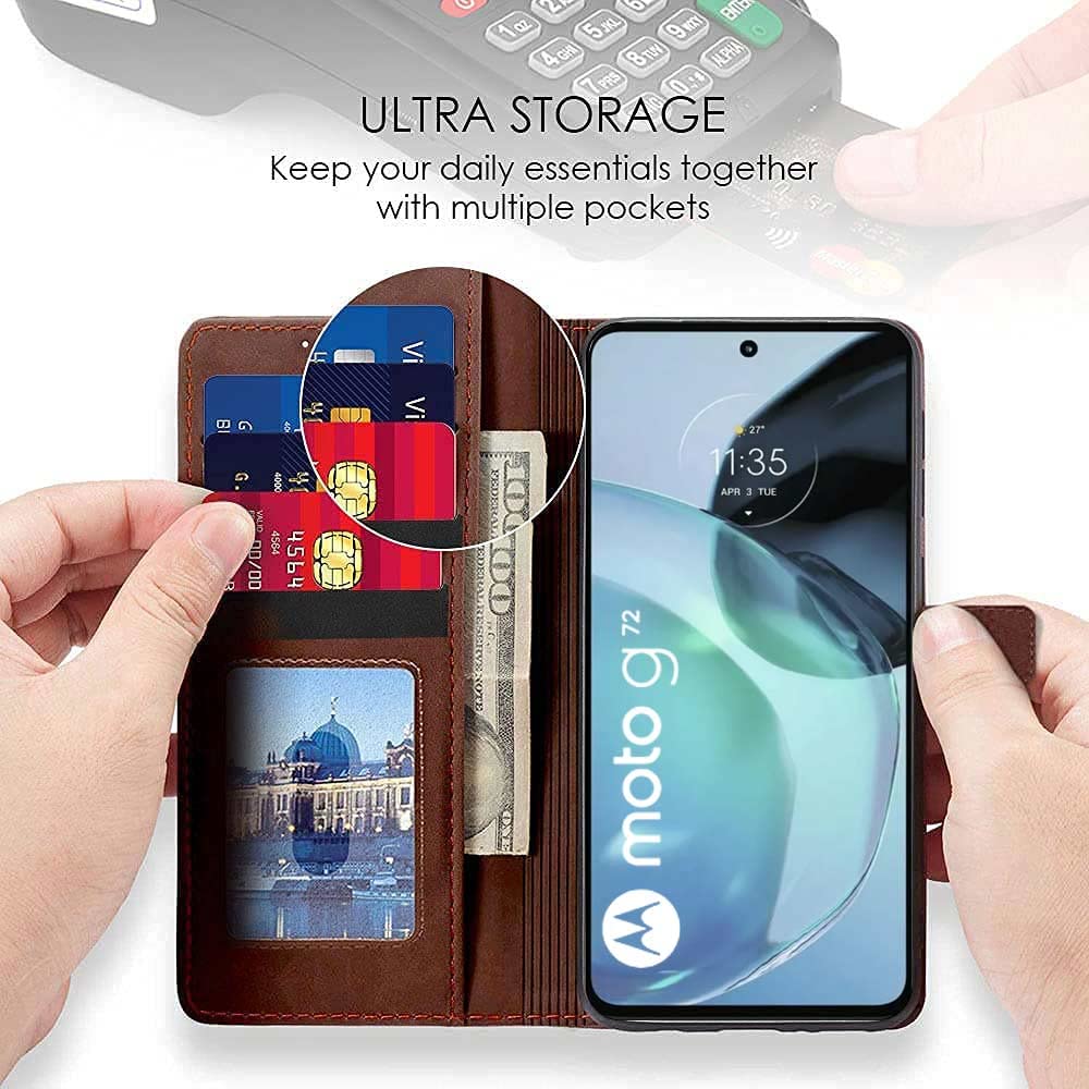 Shock Proof Flip Cover Back Case for Motorola Moto G72 | Magnetic Wallet Leather Case with Stand