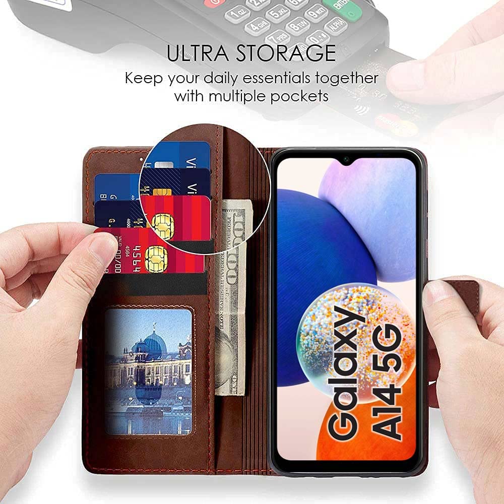 Shock Proof Flip Cover Back Case for Samsung Galaxy A14 5G | Magnetic Wallet Leather Case with Stand