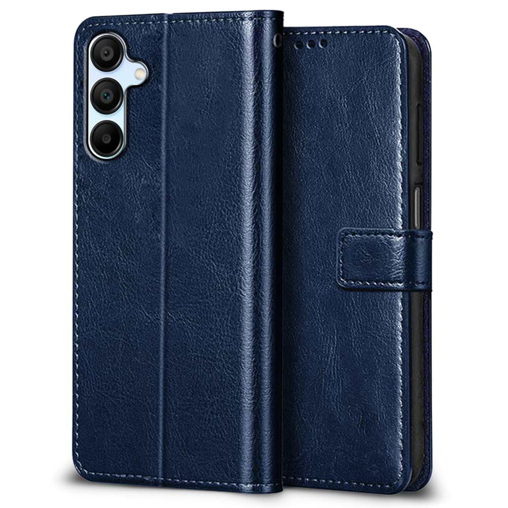 Buy premium shock proof flip cover back case for samsung galaxy a15 5g. Leather finish with magnetic flip closure, wallet pockets and stand support. Durable protection against drops and scratches with a perfect fit for samsung galaxy a15 5g.