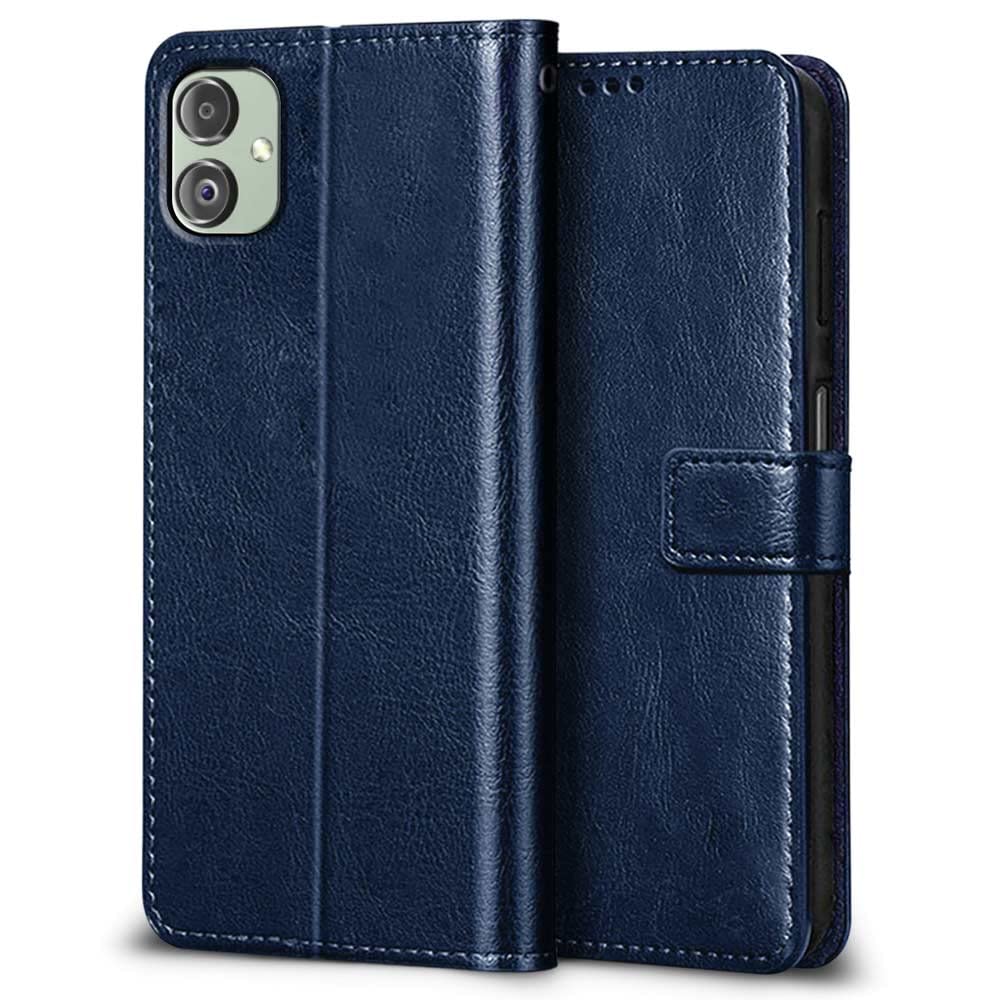 Buy premium shock proof flip cover back case for samsung galaxy f14 5g. Leather finish with magnetic flip closure, wallet pockets and stand support. Durable protection against drops and scratches with a perfect fit for samsung galaxy f14 5g.