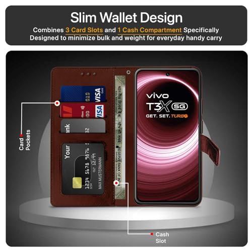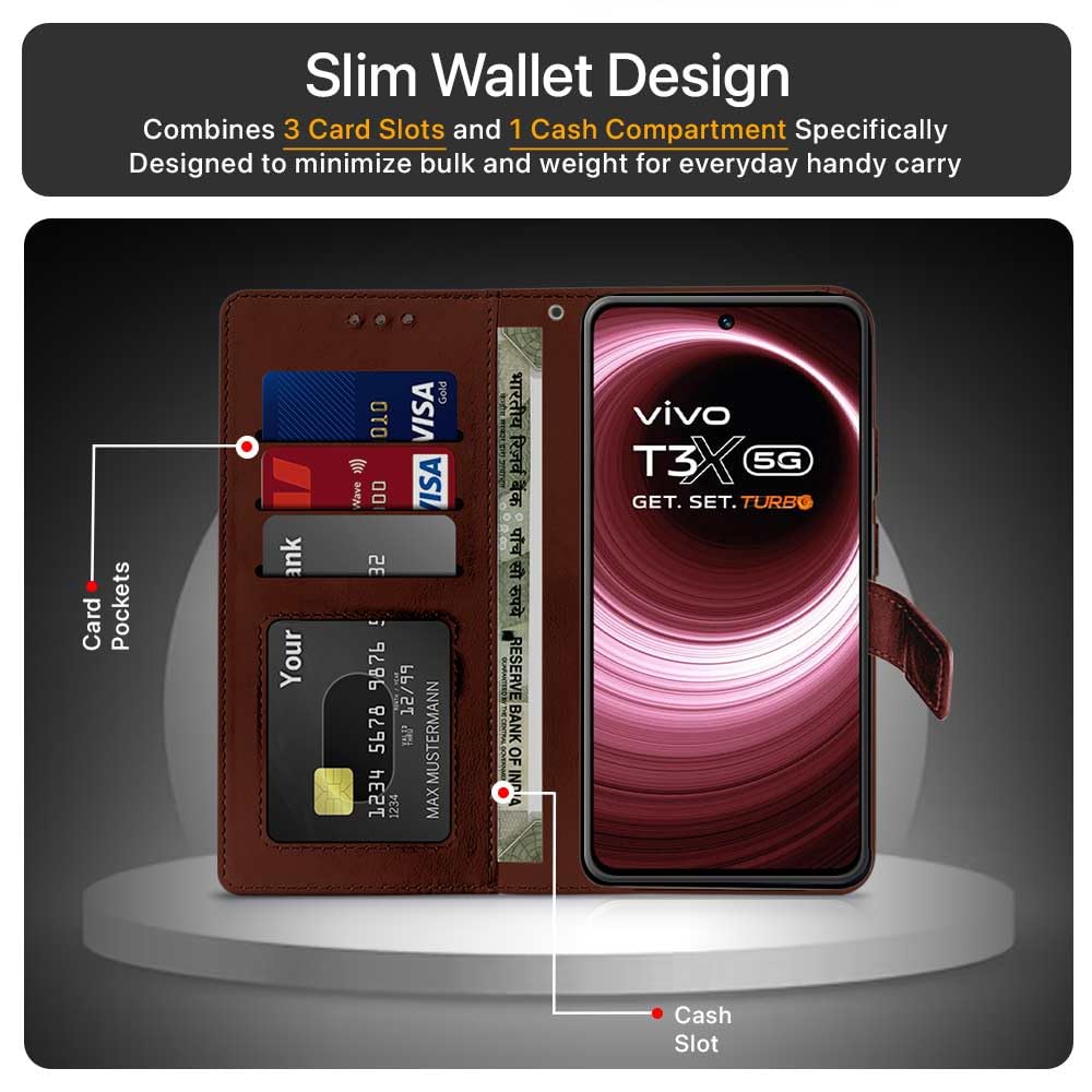 Shock Proof Flip Cover Back Case for Vivo T3X 5G | Magnetic Wallet Leather Case with Stand
