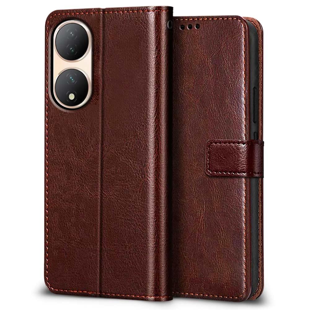 Buy premium shock proof flip cover back case for vivo y100 5g. Leather finish with magnetic flip closure, wallet pockets and stand support. Durable protection against drops and scratches with a perfect fit for vivo y100 5g.