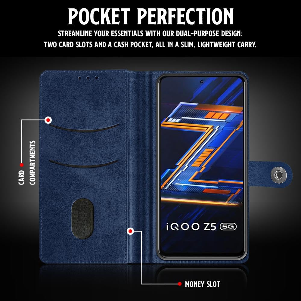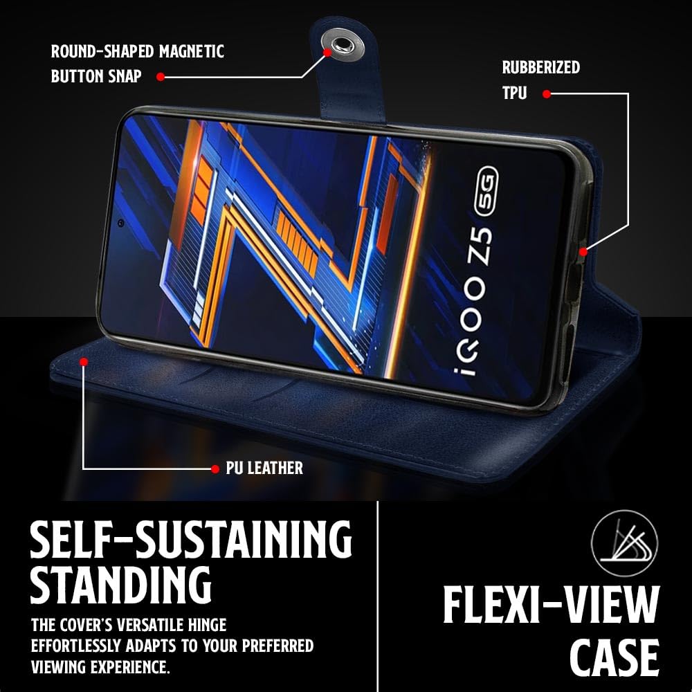 Buy premium shock proof flip cover back case for iqoo z5 5g. Leather finish with magnetic flip closure, wallet pockets and stand support. Durable protection against drops and scratches with a perfect fit for iqoo z5 5g.