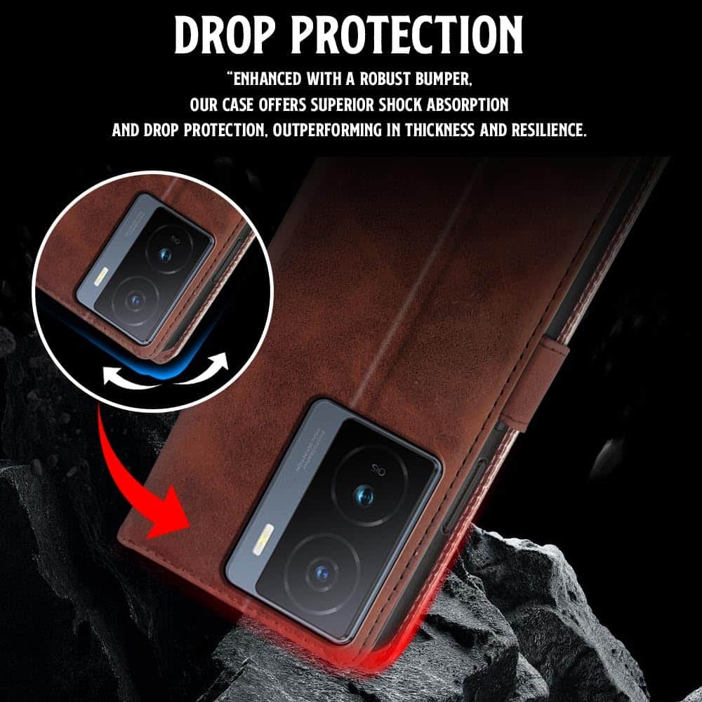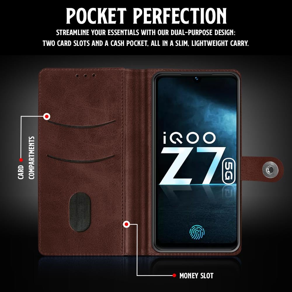Buy premium shock proof flip cover back case for iqoo z7 5g. Leather finish with magnetic flip closure, wallet pockets and stand support. Durable protection against drops and scratches with a perfect fit for iqoo z7 5g.