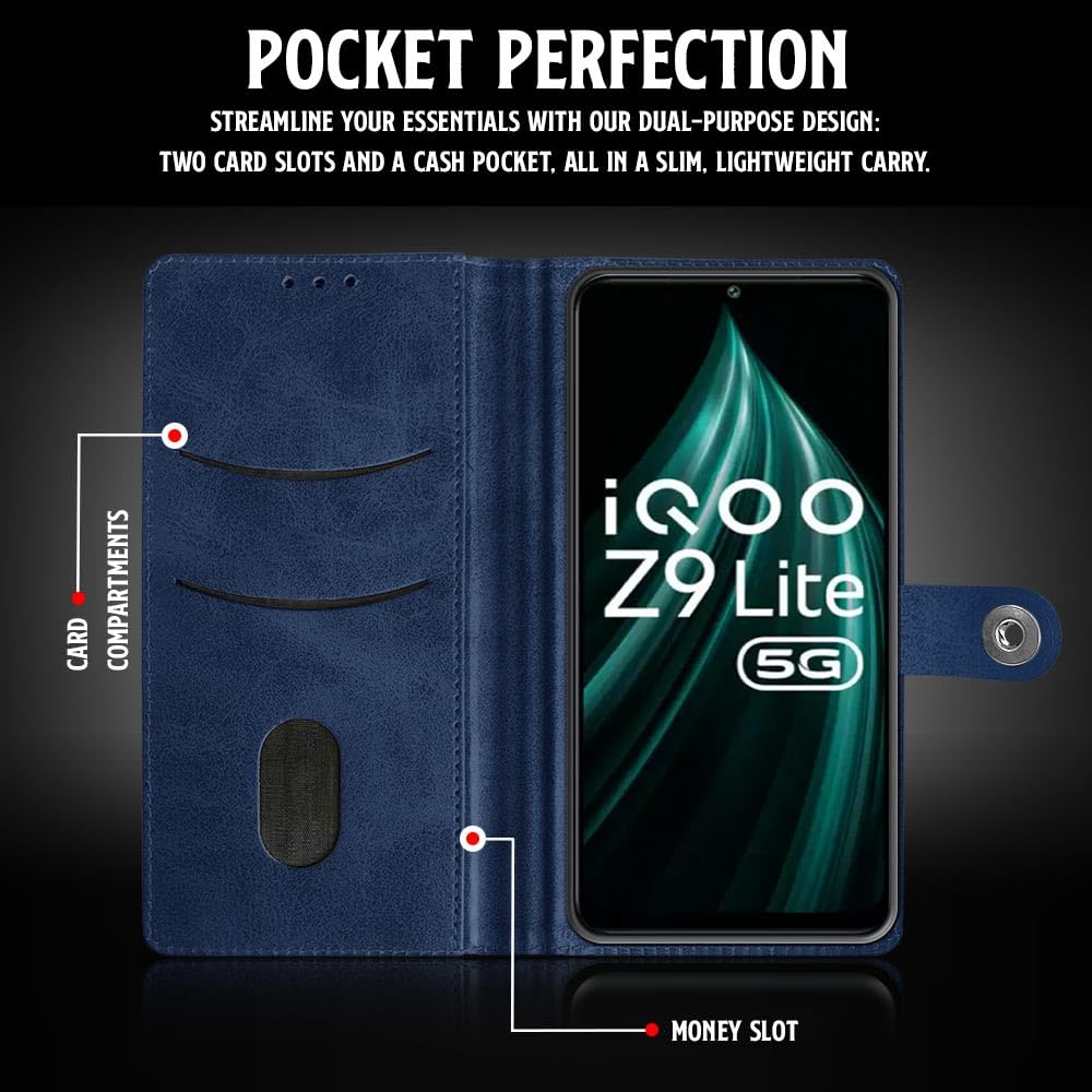Buy premium shock proof flip cover back case for iqoo z9 lite. Leather finish with magnetic flip closure, wallet pockets and stand support. Durable protection against drops and scratches with a perfect fit for iqoo z9 lite.