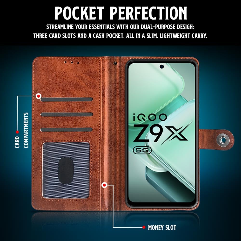 Shock Proof Flip Cover Back Case for Iqoo Z9X 5G | Magnetic Wallet Leather Case with Stand