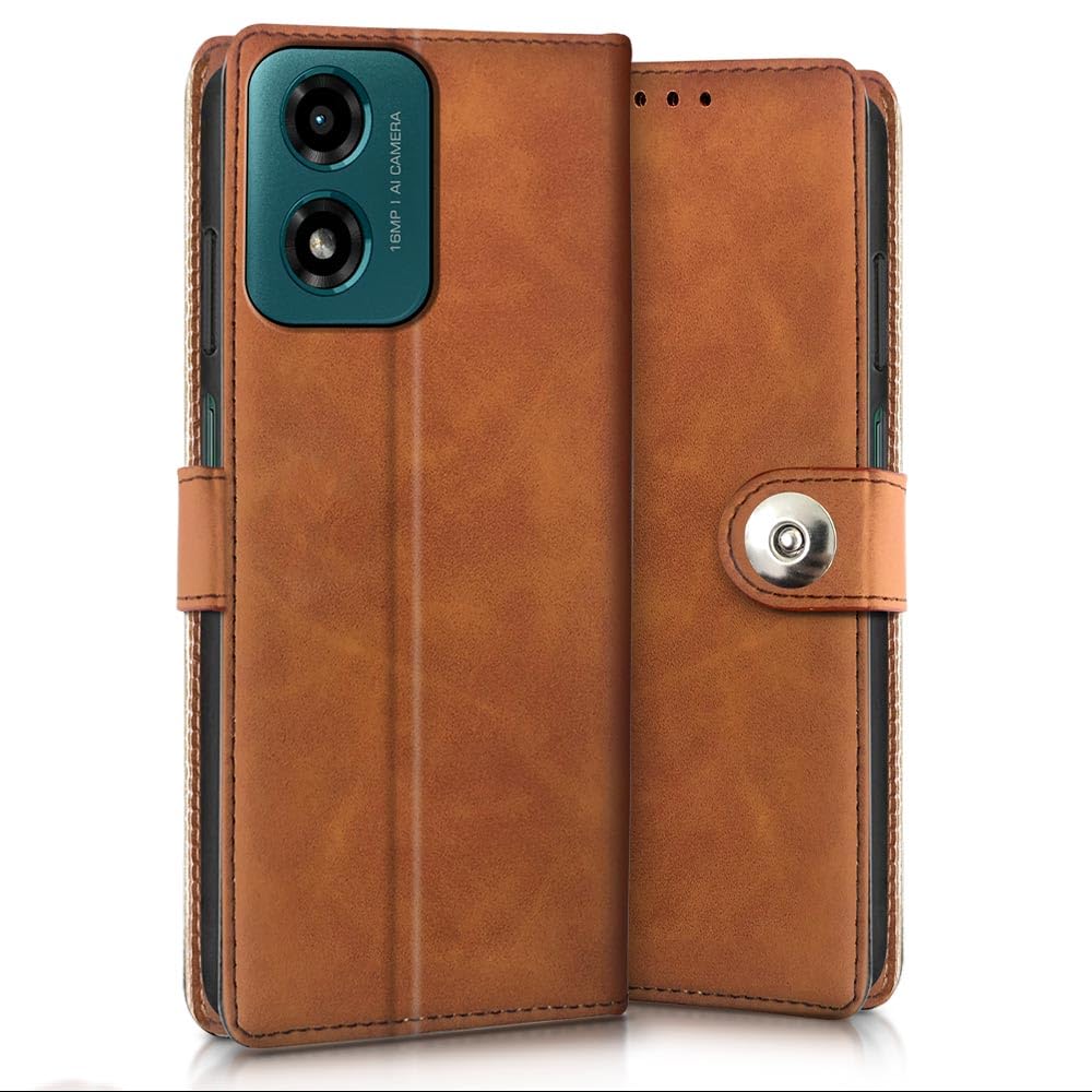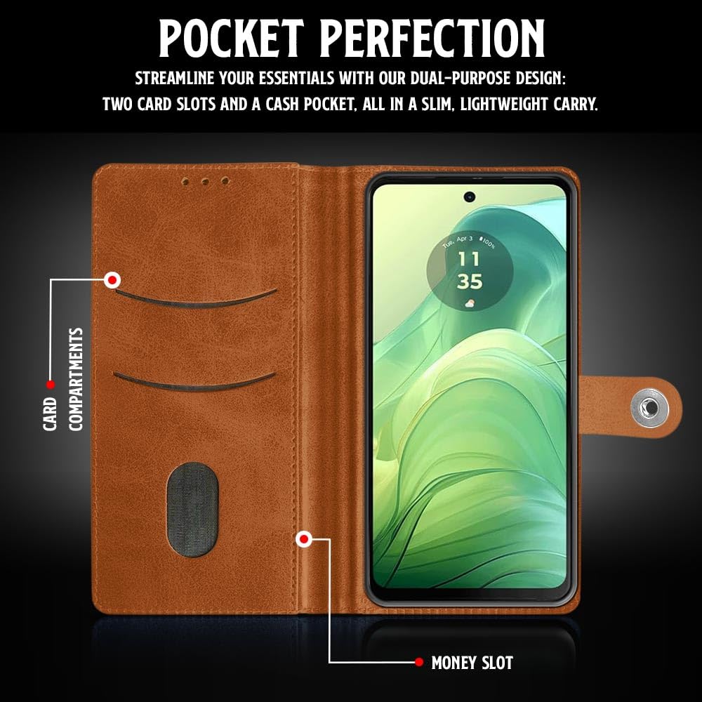 Buy premium shock proof flip cover back case for motorola moto g04. Leather finish with magnetic flip closure, wallet pockets and stand support. Durable protection against drops and scratches with a perfect fit for motorola moto g04.