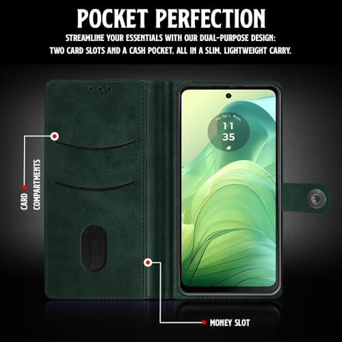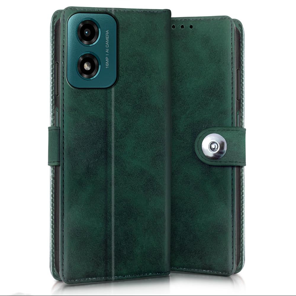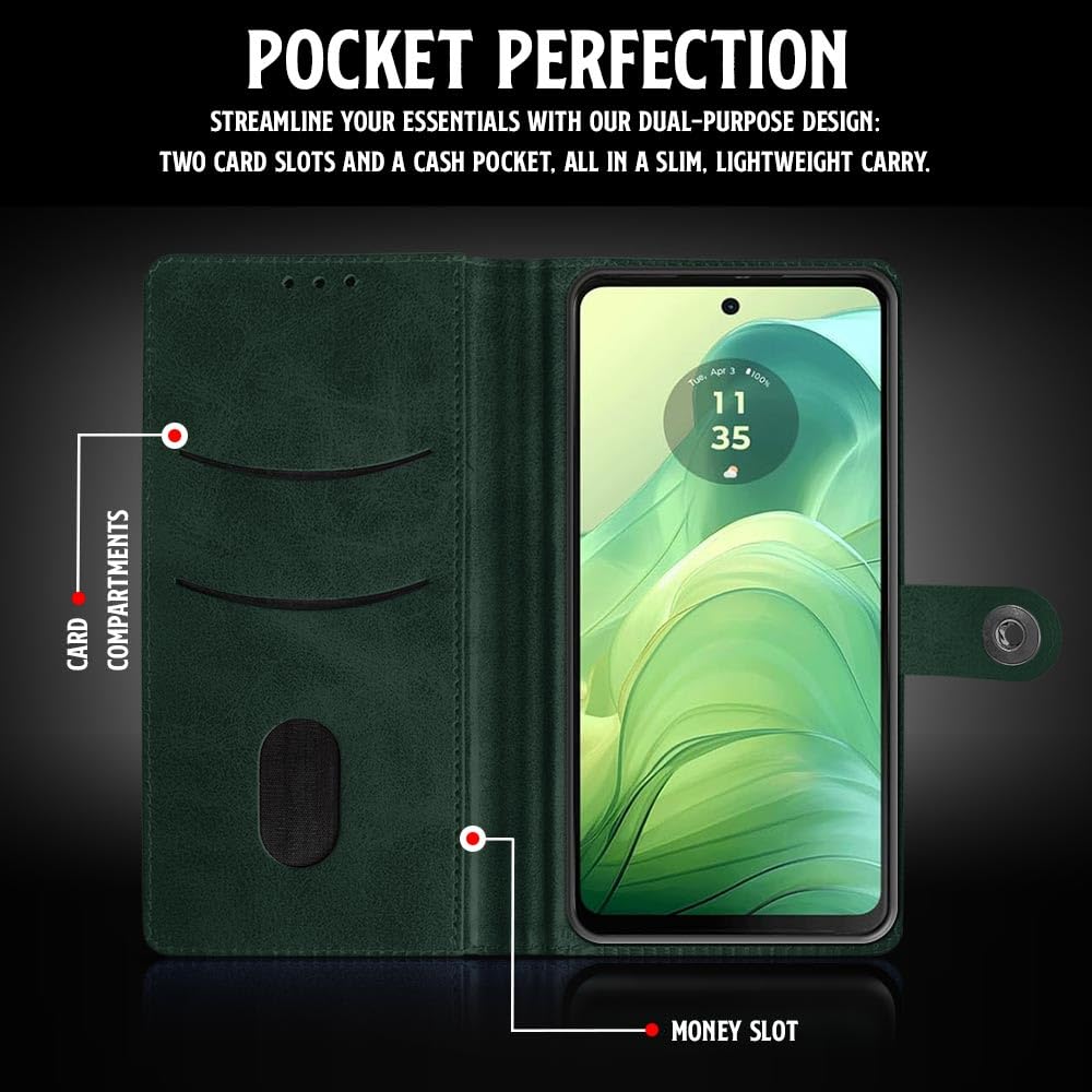 Buy premium shock proof flip cover back case for motorola moto g04. Leather finish with magnetic flip closure, wallet pockets and stand support. Durable protection against drops and scratches with a perfect fit for motorola moto g04.