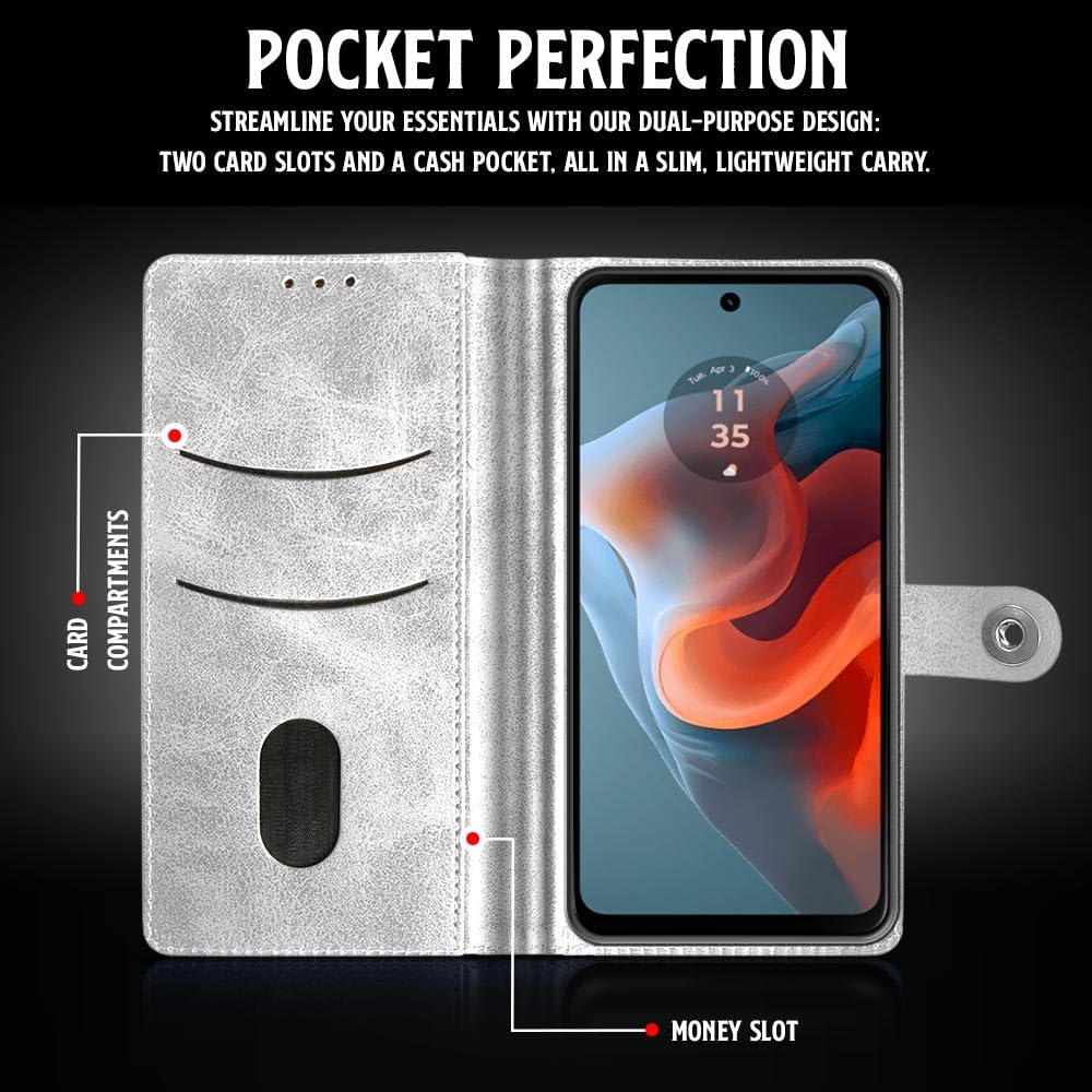 Buy premium shock proof flip cover back case for motorola moto g34 5g. Leather finish with magnetic flip closure, wallet pockets and stand support. Durable protection against drops and scratches with a perfect fit for motorola moto g34 5g.