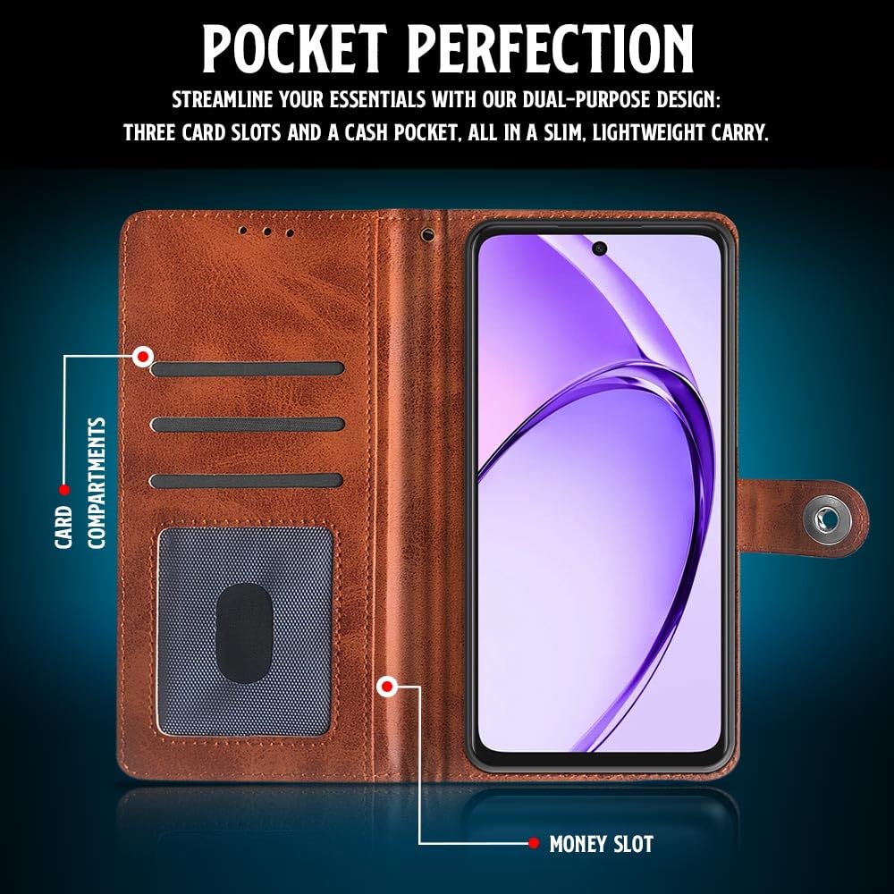Buy premium shock proof flip cover back case for oppo a3x 5g. Leather finish with magnetic flip closure, wallet pockets and stand support. Durable protection against drops and scratches with a perfect fit for oppo a3x 5g.