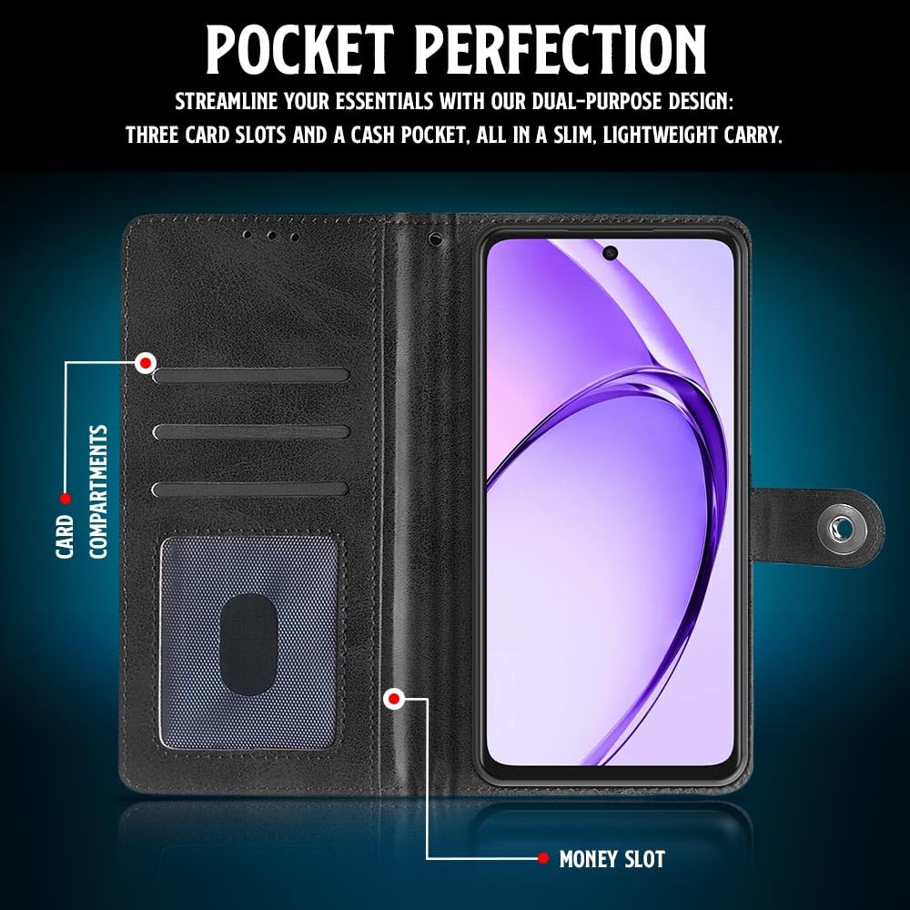 Buy premium shock proof flip cover back case for oppo a3x 5g. Leather finish with magnetic flip closure, wallet pockets and stand support. Durable protection against drops and scratches with a perfect fit for oppo a3x 5g.