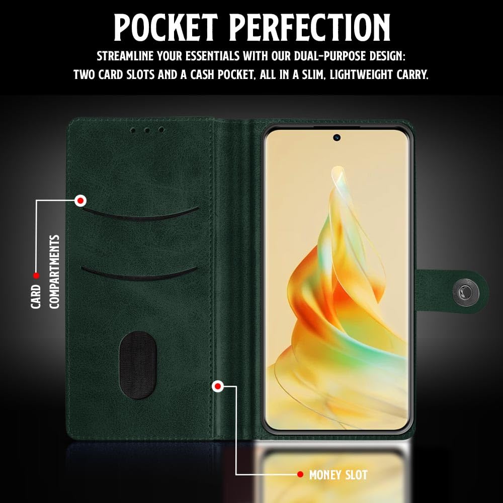 Buy premium shock proof flip cover back case for oppo reno8 t. Leather finish with magnetic flip closure, wallet pockets and stand support. Durable protection against drops and scratches with a perfect fit for oppo reno8 t.