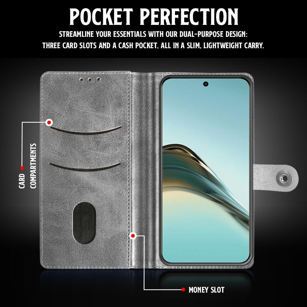 Buy premium shock proof flip cover back case for realme 13 plus 5g. Leather finish with magnetic flip closure, wallet pockets and stand support. Durable protection against drops and scratches with a perfect fit for realme 13 plus 5g.