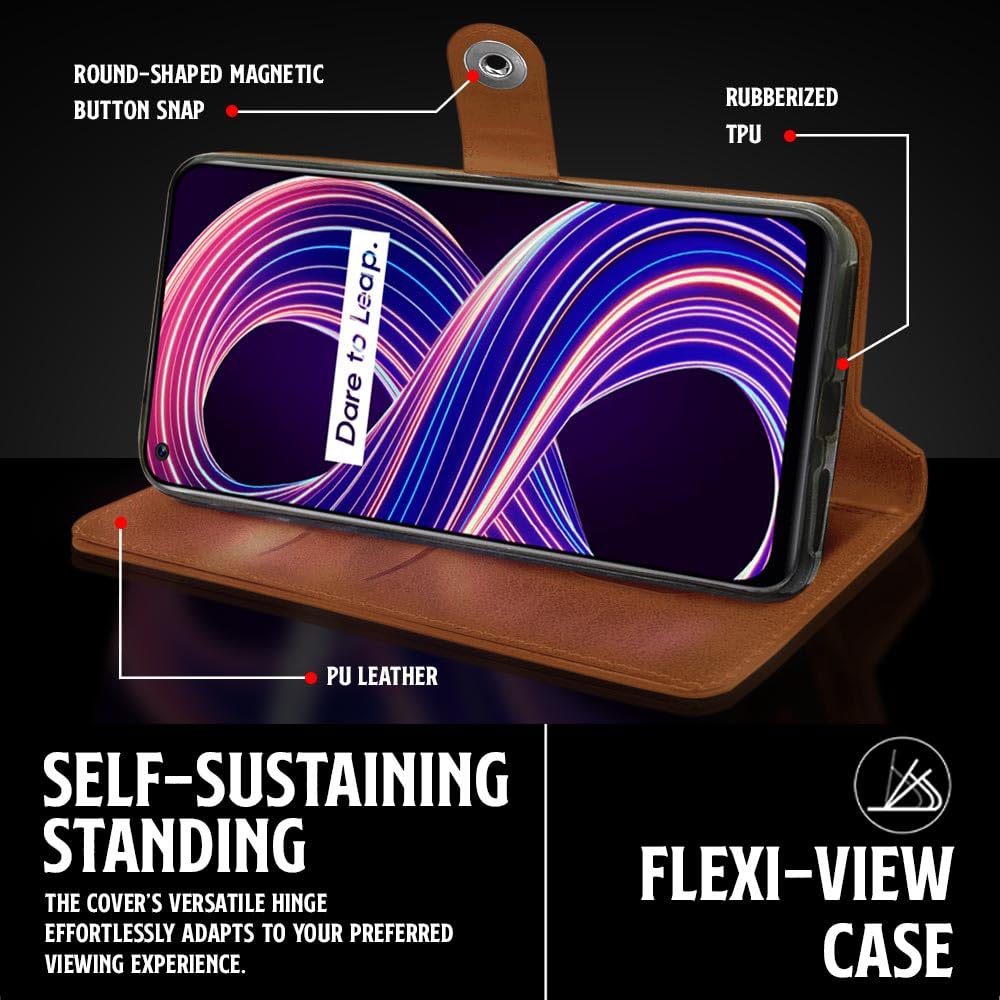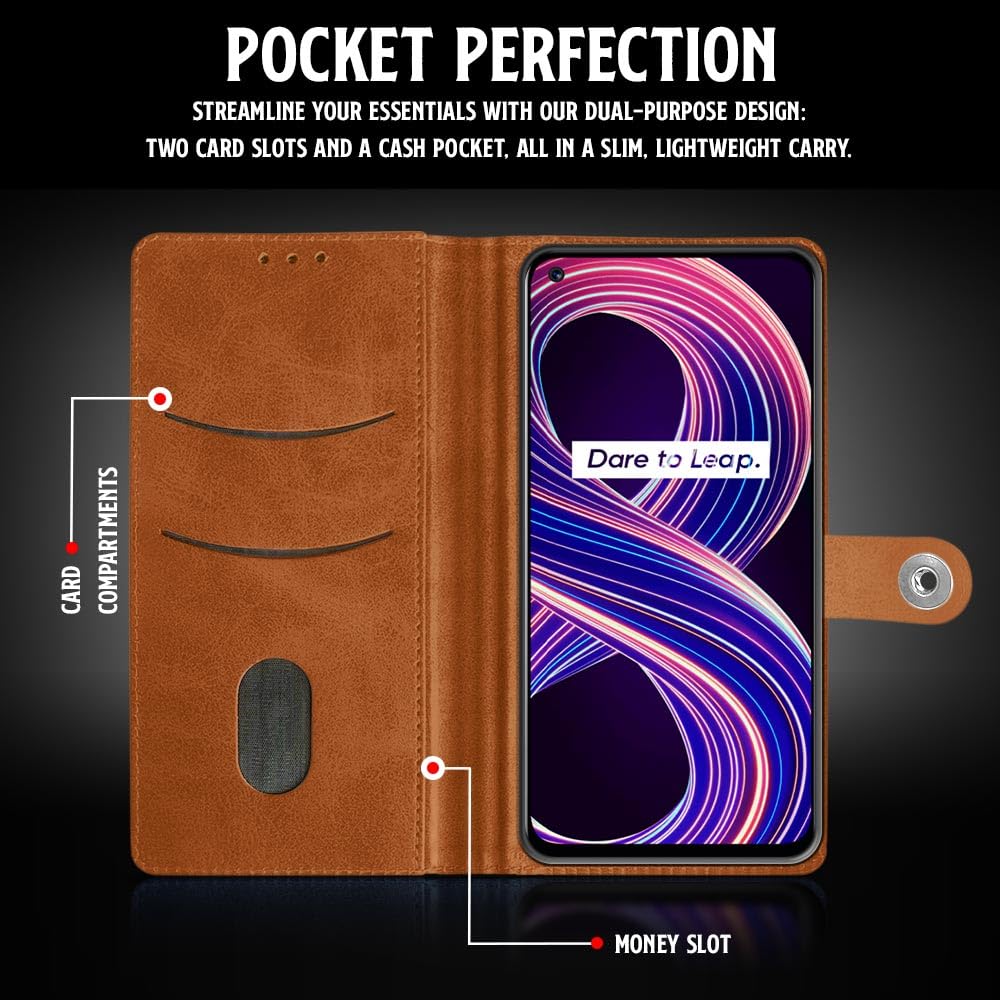 Buy premium shock proof flip cover back case for realme narzo 30 5g, 9, 8, 8s. Leather finish with magnetic flip closure, wallet pockets and stand support. Durable protection against drops and scratches with a perfect fit for realme narzo 30 5g, 9, 8, 8s.