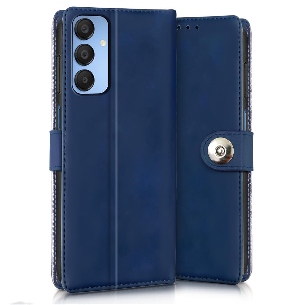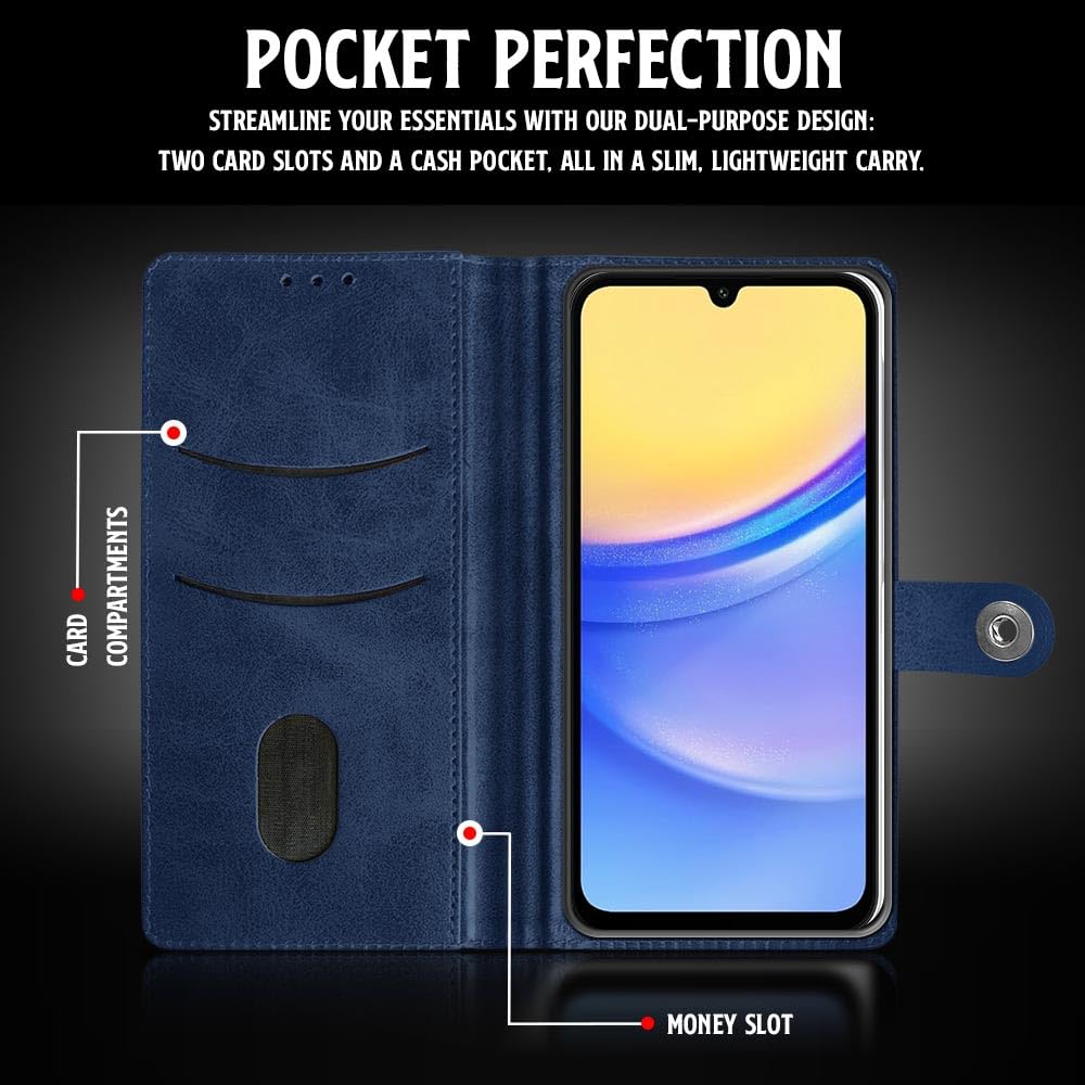 Buy premium shock proof flip cover back case for samsung galaxy a15 5g. Leather finish with magnetic flip closure, wallet pockets and stand support. Durable protection against drops and scratches with a perfect fit for samsung galaxy a15 5g.