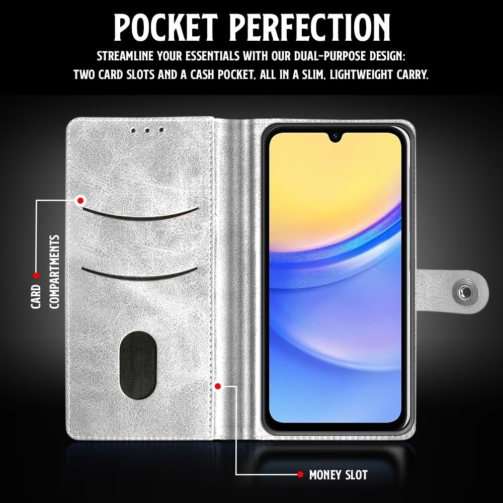 Buy premium shock proof flip cover back case for samsung galaxy a15 5g. Leather finish with magnetic flip closure, wallet pockets and stand support. Durable protection against drops and scratches with a perfect fit for samsung galaxy a15 5g.