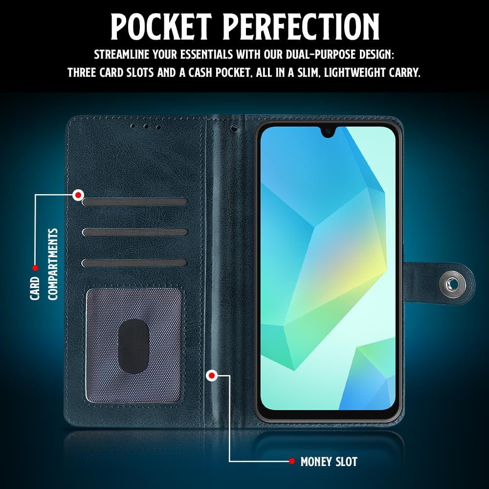Buy premium shock proof flip cover back case for samsung galaxy a16 5g. Leather finish with magnetic flip closure, wallet pockets and stand support. Durable protection against drops and scratches with a perfect fit for samsung galaxy a16 5g.