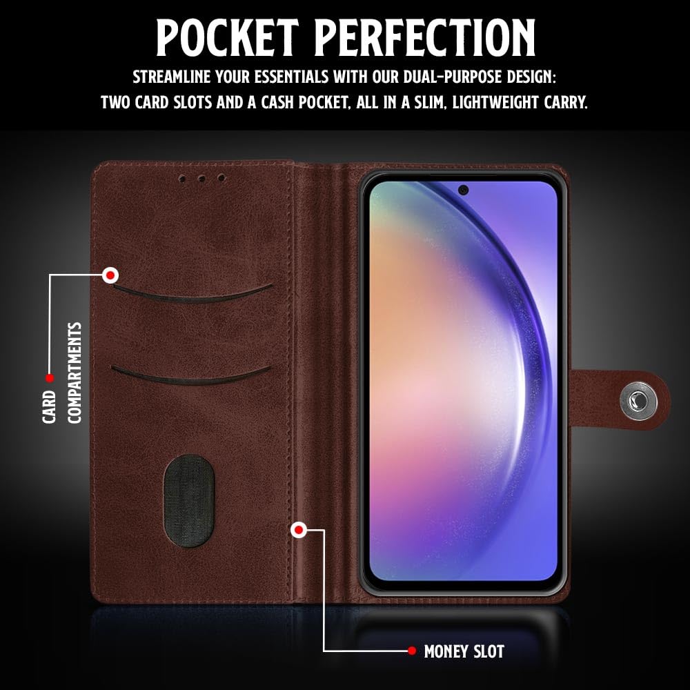 Buy premium shock proof flip cover back case for samsung galaxy a54 5g. Leather finish with magnetic flip closure, wallet pockets and stand support. Durable protection against drops and scratches with a perfect fit for samsung galaxy a54 5g.