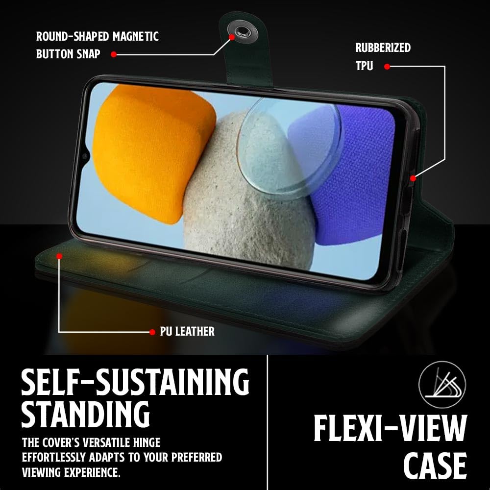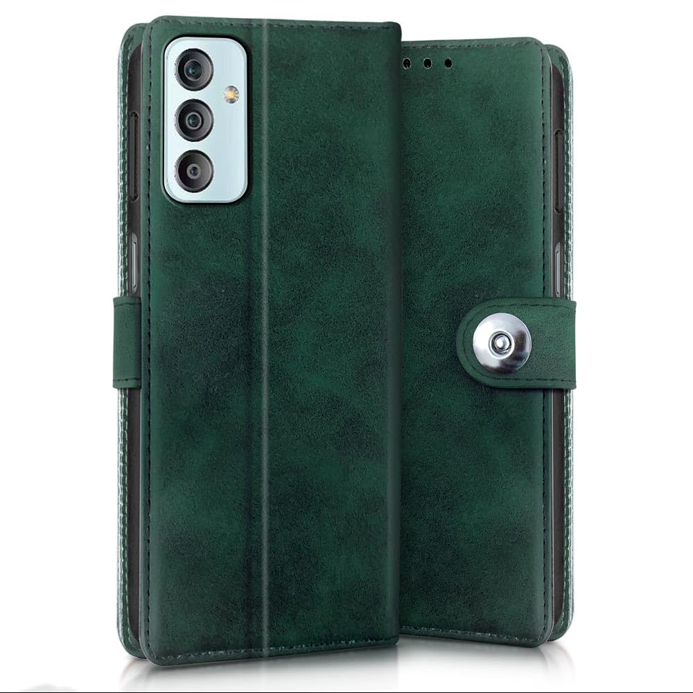 Buy premium shock proof flip cover back case for samsung galaxy f23 5g. Leather finish with magnetic flip closure, wallet pockets and stand support. Durable protection against drops and scratches with a perfect fit for samsung galaxy f23 5g.