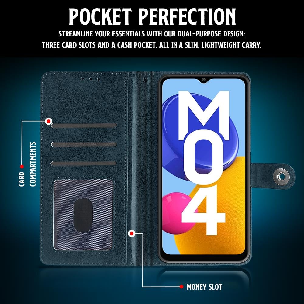 Buy premium shock proof flip cover back case for samsung galaxy m04 4g. Leather finish with magnetic flip closure, wallet pockets and stand support. Durable protection against drops and scratches with a perfect fit for samsung galaxy m04 4g.