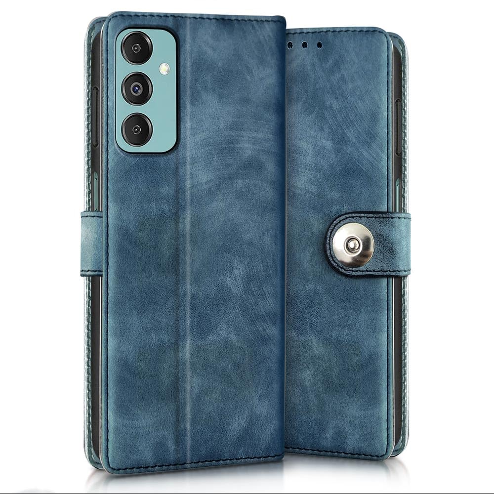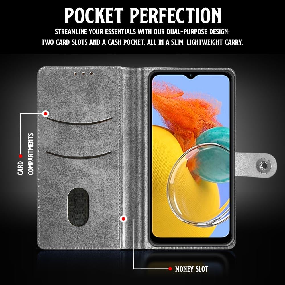 Buy premium shock proof flip cover back case for samsung galaxy m14 5g. Leather finish with magnetic flip closure, wallet pockets and stand support. Durable protection against drops and scratches with a perfect fit for samsung galaxy m14 5g.