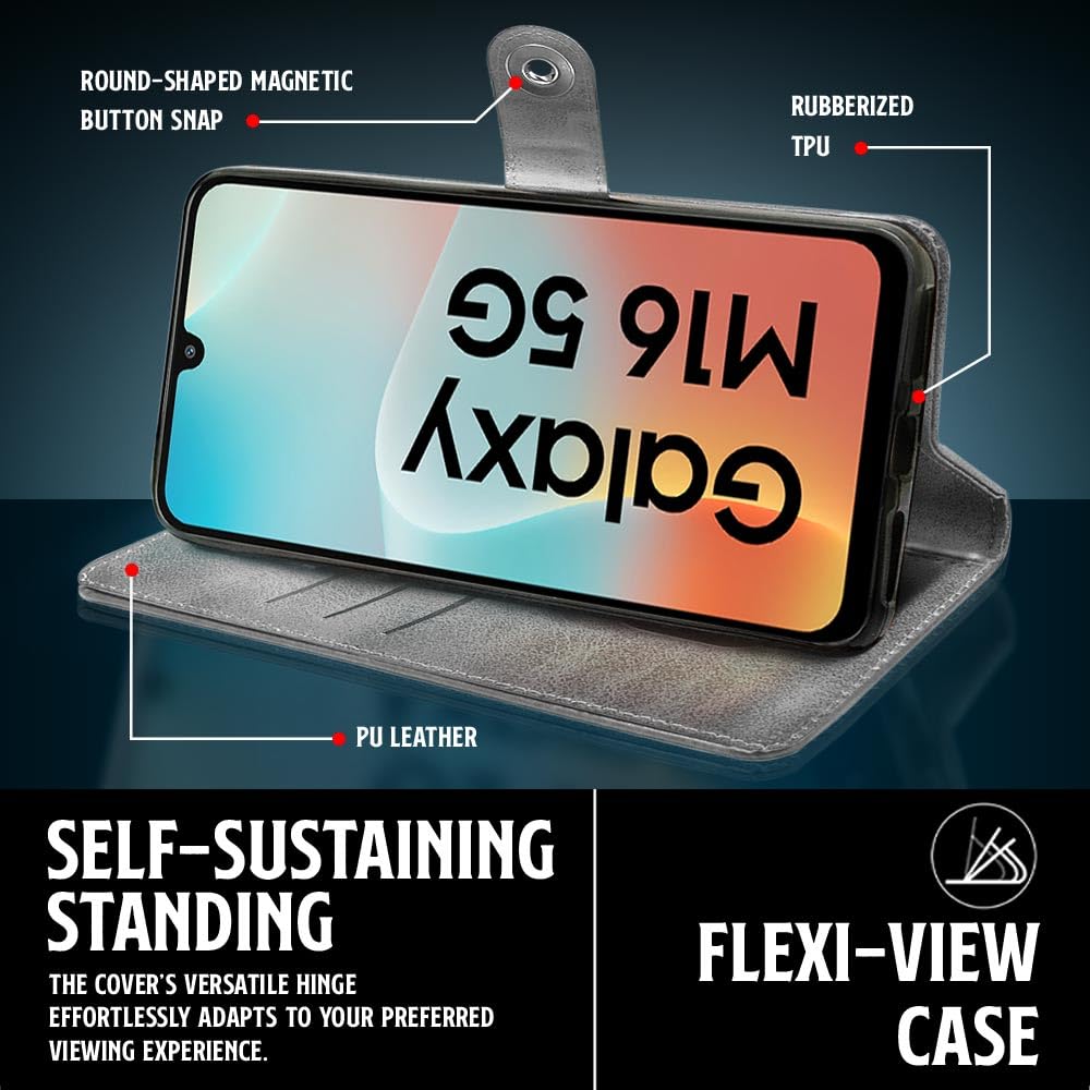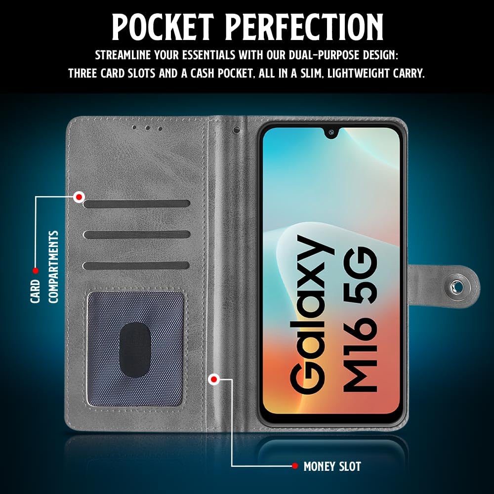 Buy premium shock proof flip cover back case for samsung galaxy m16 5g. Leather finish with magnetic flip closure, wallet pockets and stand support. Durable protection against drops and scratches with a perfect fit for samsung galaxy m16 5g.