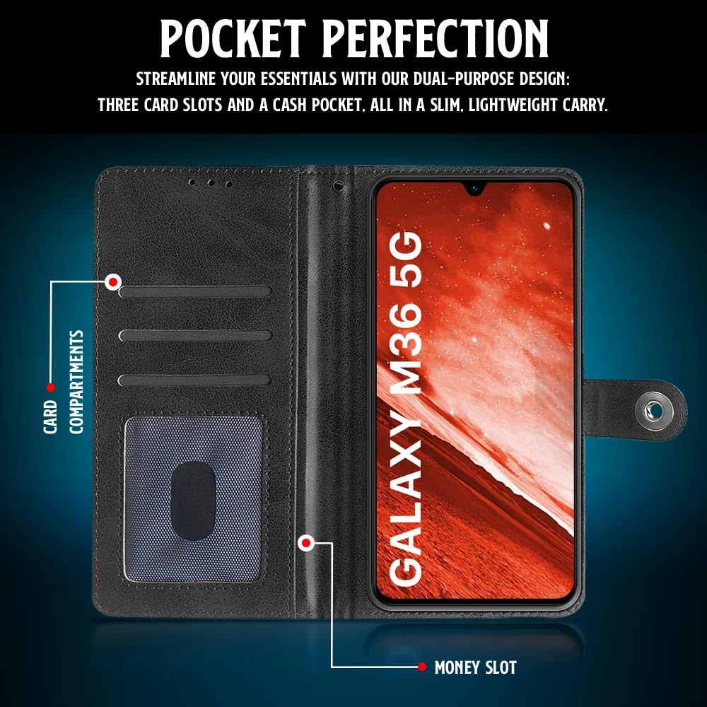 Shock Proof Flip Cover Back Case for Samsung Galaxy M36 5G | Magnetic Wallet Leather Case with Stand