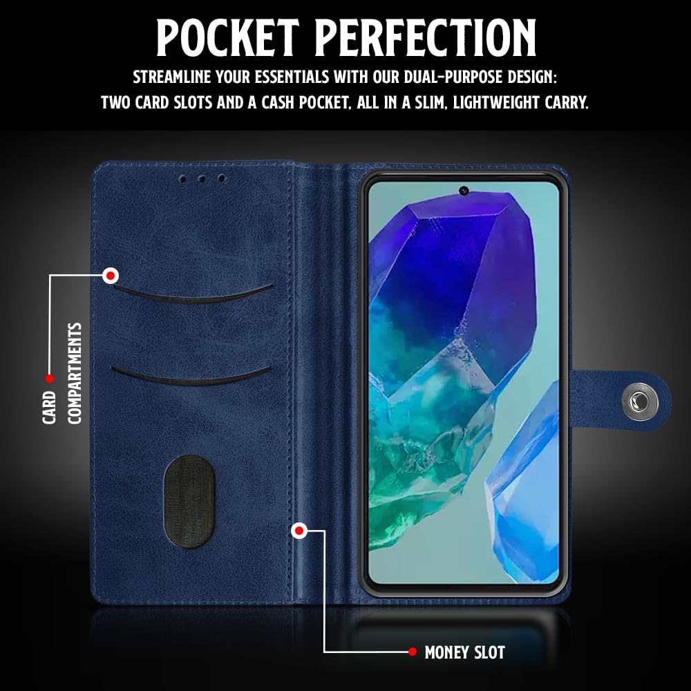 Buy premium shock proof flip cover back case for samsung galaxy m55 5g. Leather finish with magnetic flip closure, wallet pockets and stand support. Durable protection against drops and scratches with a perfect fit for samsung galaxy m55 5g.