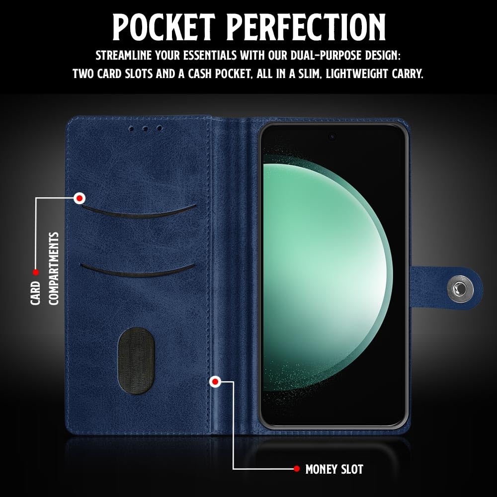 Buy premium shock proof flip cover back case for samsung galaxy s23 fe 5g. Leather finish with magnetic flip closure, wallet pockets and stand support. Durable protection against drops and scratches with a perfect fit for samsung galaxy s23 fe 5g.