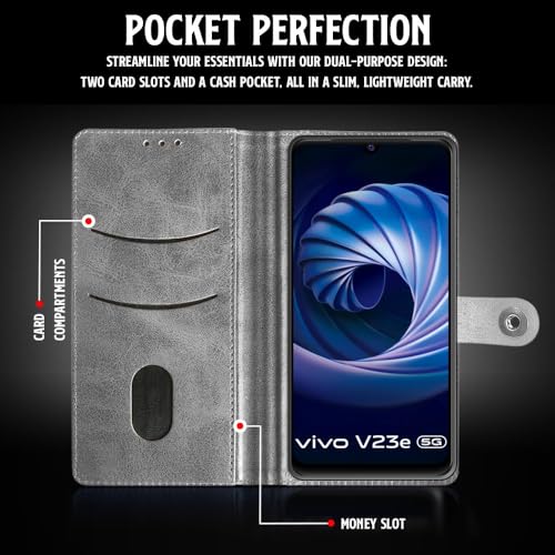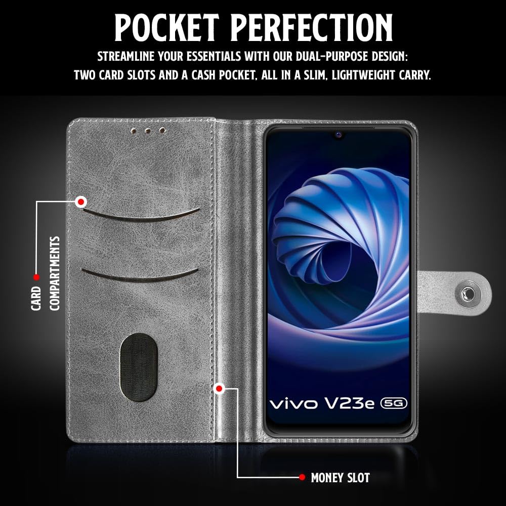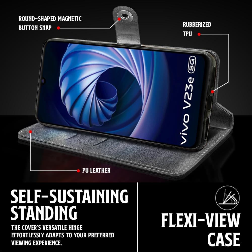 Buy premium shock proof flip cover back case for vivo v23e 5g. Leather finish with magnetic flip closure, wallet pockets and stand support. Durable protection against drops and scratches with a perfect fit for vivo v23e 5g.