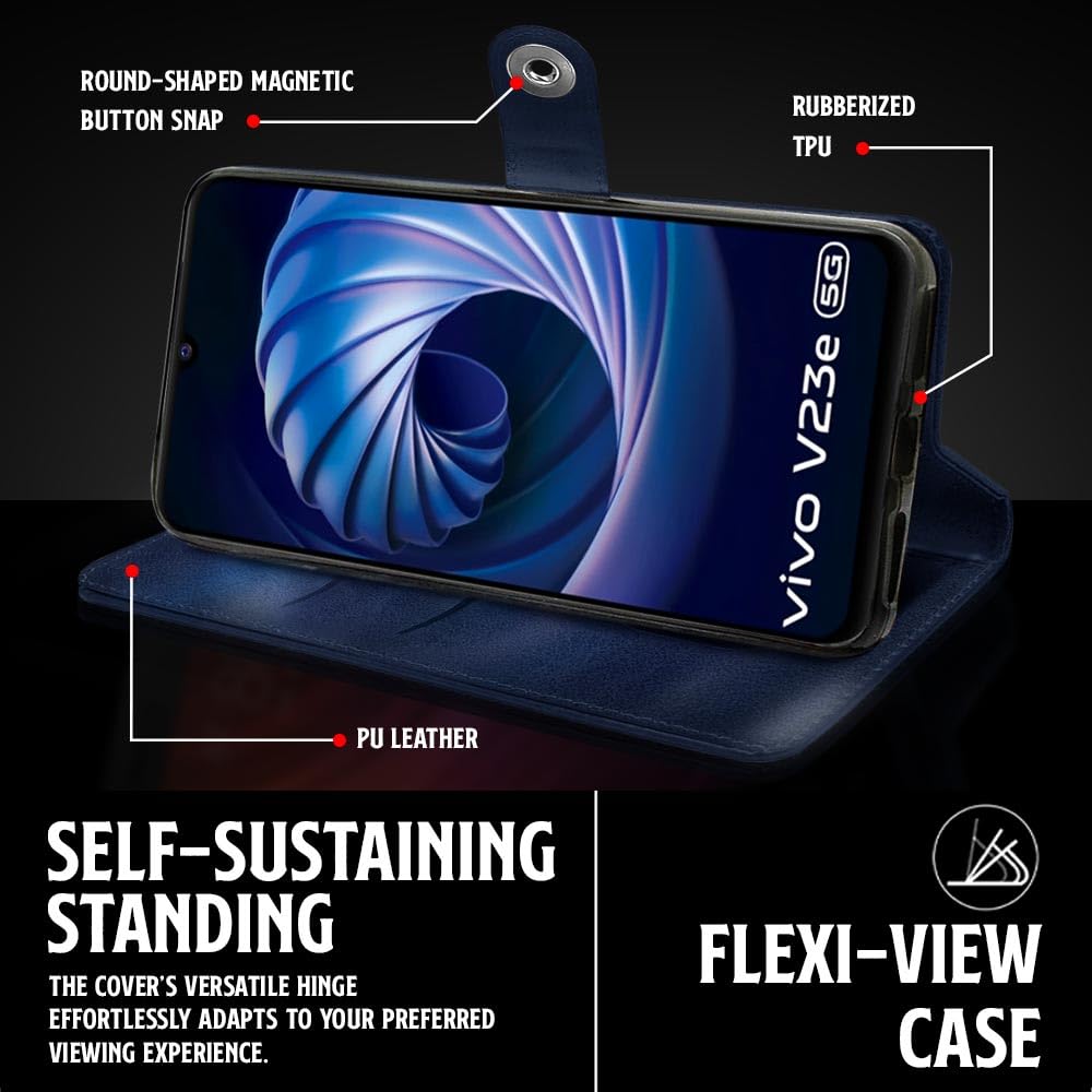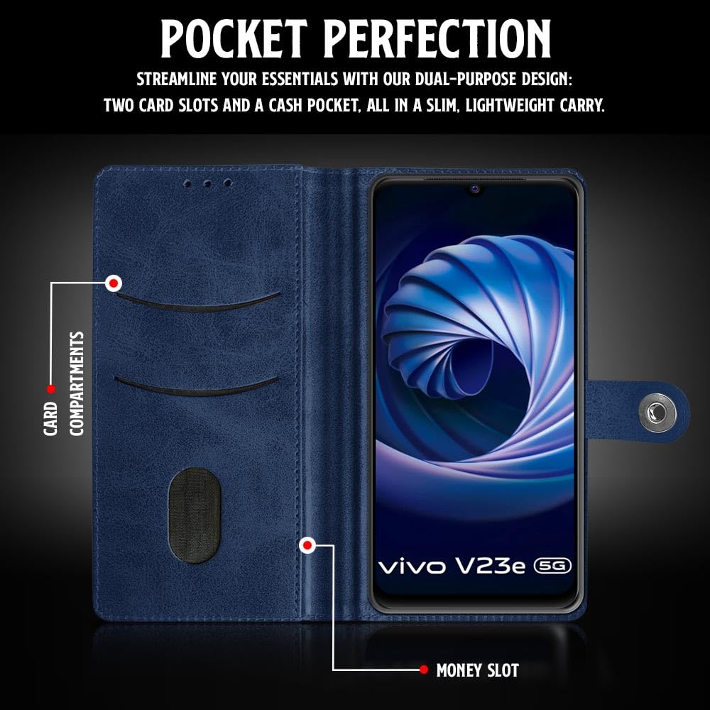 Buy premium shock proof flip cover back case for vivo v23e 5g. Leather finish with magnetic flip closure, wallet pockets and stand support. Durable protection against drops and scratches with a perfect fit for vivo v23e 5g.