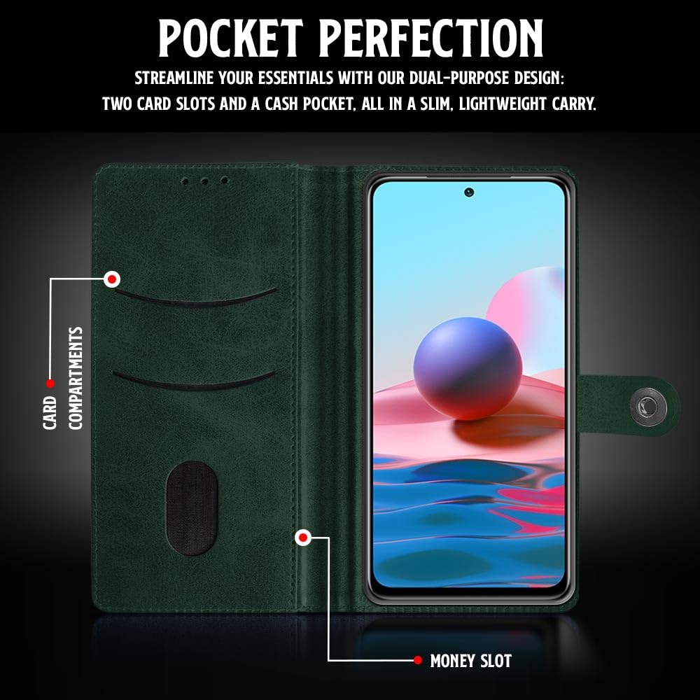Buy premium shock proof flip cover back case for xiaomi redmi note 10. Leather finish with magnetic flip closure, wallet pockets and stand support. Durable protection against drops and scratches with a perfect fit for xiaomi redmi note 10.