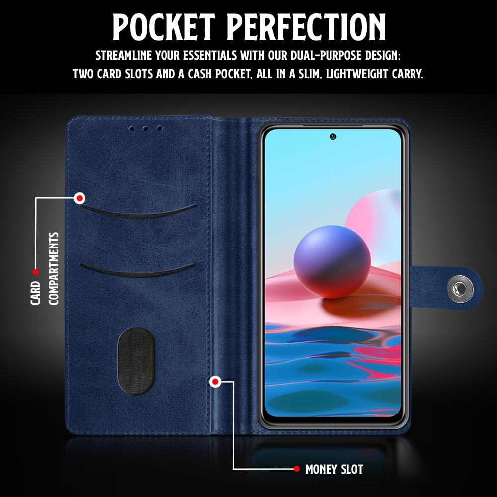 Buy premium shock proof flip cover back case for xiaomi redmi note 10. Leather finish with magnetic flip closure, wallet pockets and stand support. Durable protection against drops and scratches with a perfect fit for xiaomi redmi note 10.