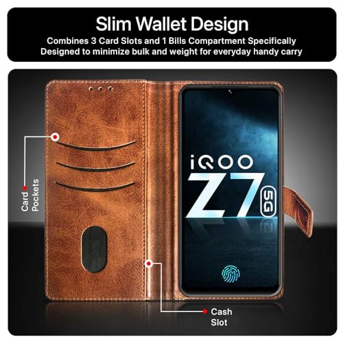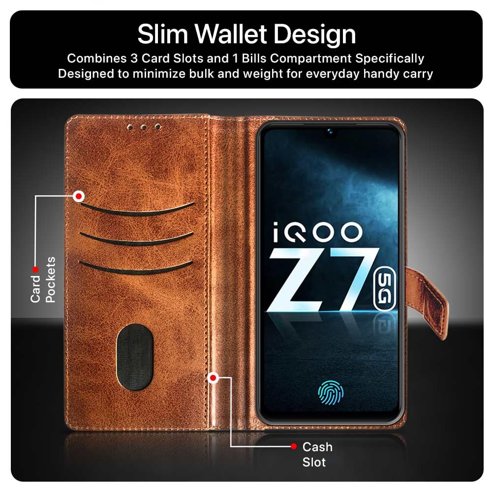 Buy premium shock proof flip cover back case for iqoo z7 5g. Leather finish with magnetic flip closure, wallet pockets and stand support. Durable protection against drops and scratches with a perfect fit for iqoo z7 5g.