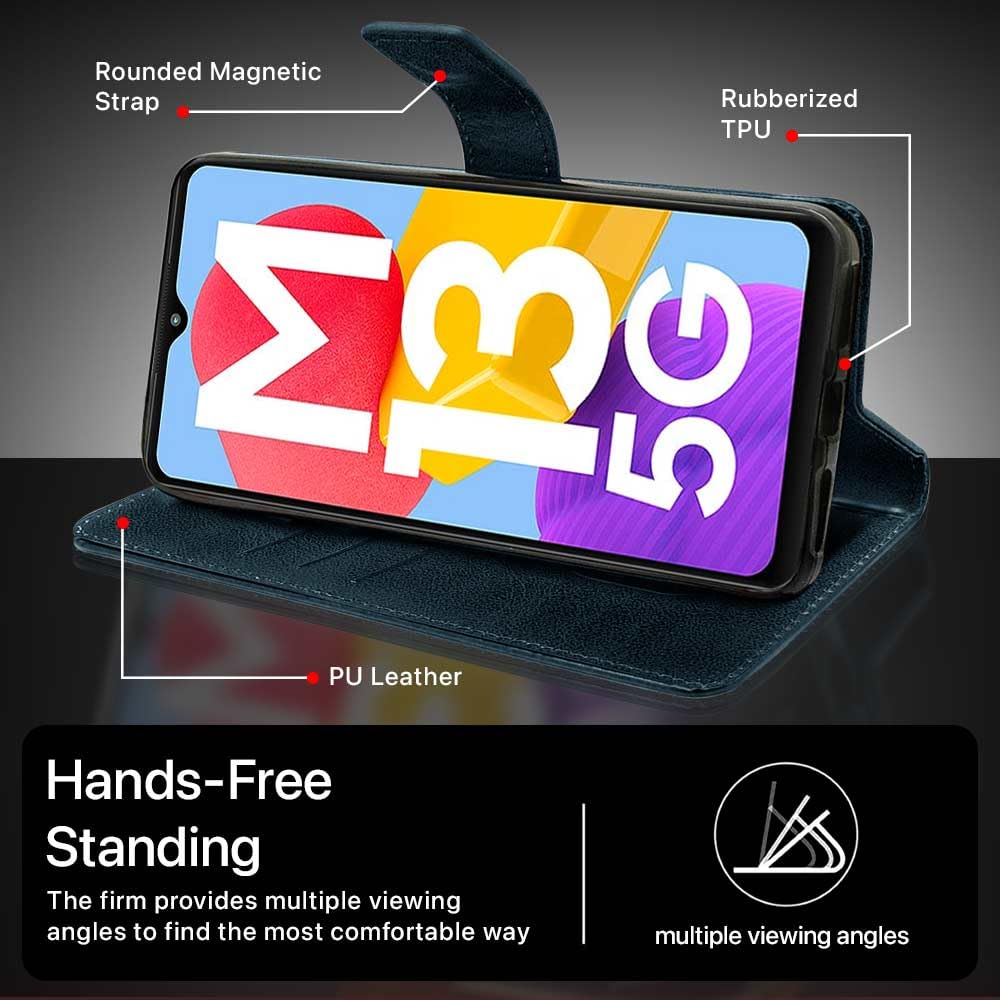 Buy premium shock proof flip cover back case for samsung galaxy m13 5g. Leather finish with magnetic flip closure, wallet pockets and stand support. Durable protection against drops and scratches with a perfect fit for samsung galaxy m13 5g.