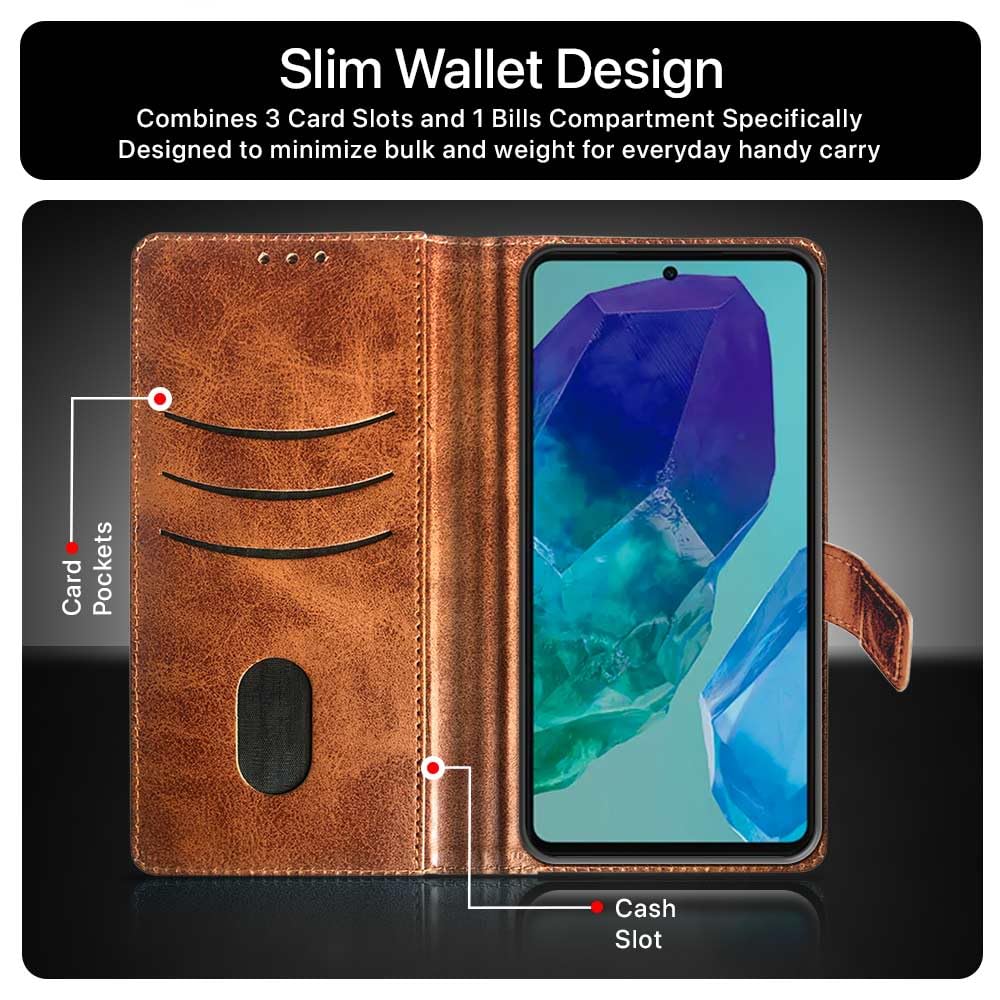 Buy premium shock proof flip cover back case for samsung galaxy m55 5g. Leather finish with magnetic flip closure, wallet pockets and stand support. Durable protection against drops and scratches with a perfect fit for samsung galaxy m55 5g.