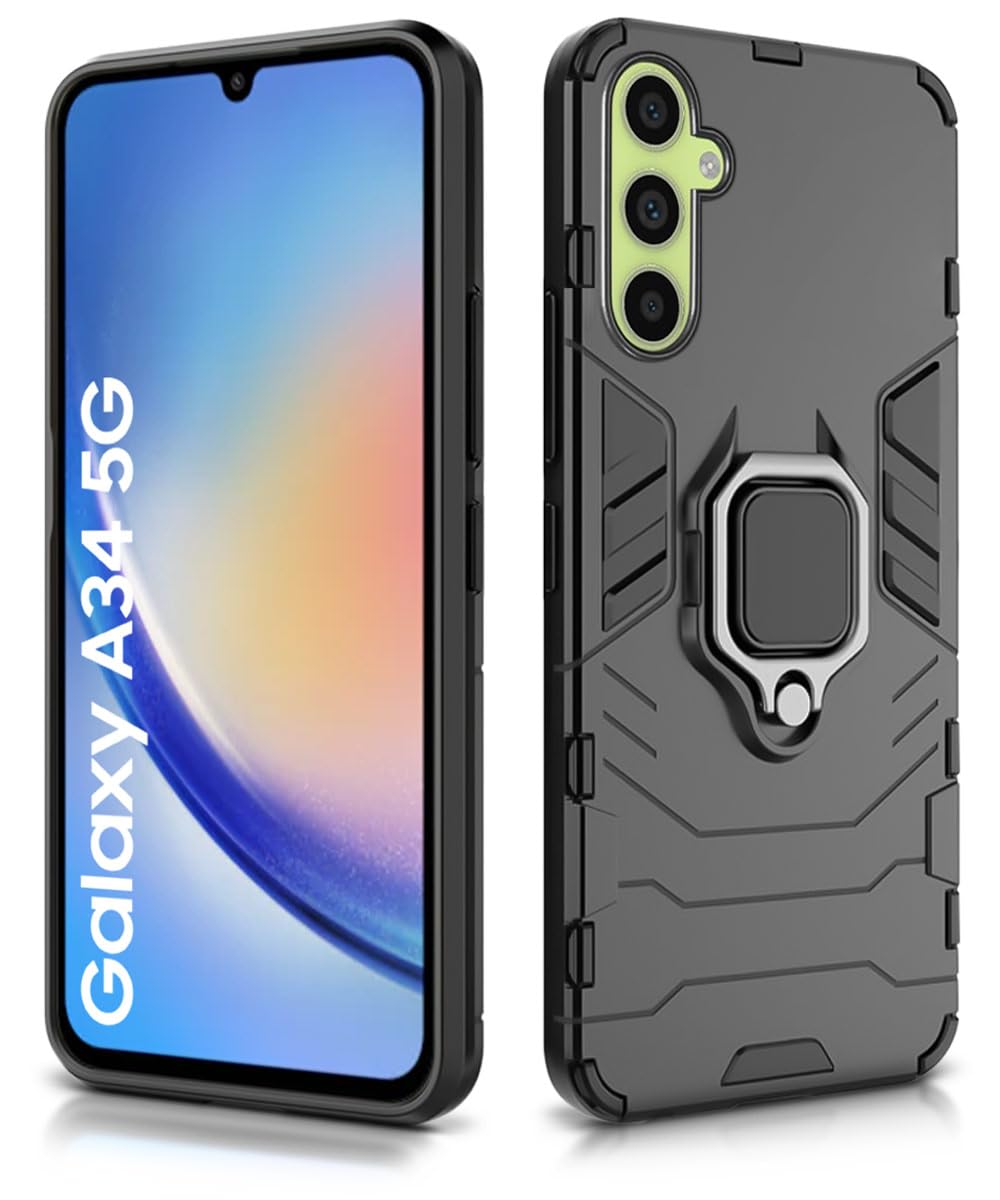 Tough Armor Back Case Mobile Cover for Samsung Galaxy A34 5G (Armored | Hybrid PC & TPU | Shock Proof 360 Degree Protection with Ring Holder Kickstand | Carbon Black)