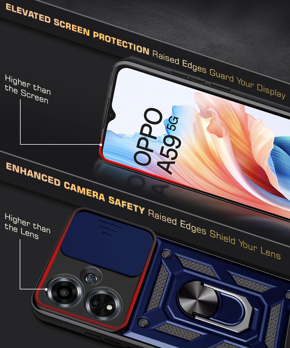 Tough Armor Bumper Mobile Back Case for Oppo A59 5G | Sliding Camera Shield Cover | Shock Proof 360? Protection | Hybrid PC + TPU | Ring Holder with Kickstand ? Blue