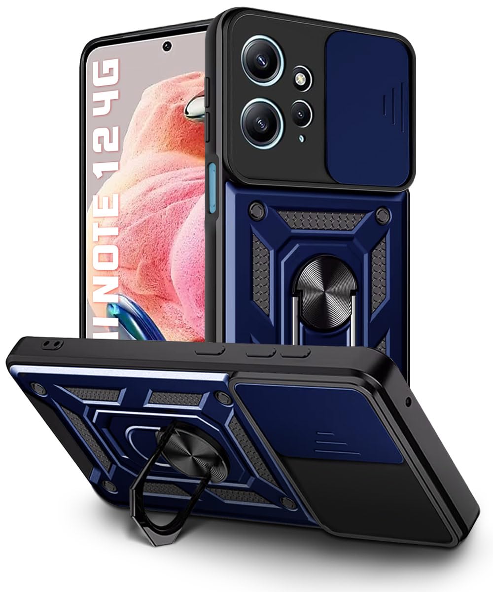 Tough Armor Bumper Mobile Back Case for Redmi Note 12 4G | Sliding Camera Shield Cover | Shock Proof 360? Protection | Hybrid PC + TPU | Ring Holder with Kickstand ? Blue
