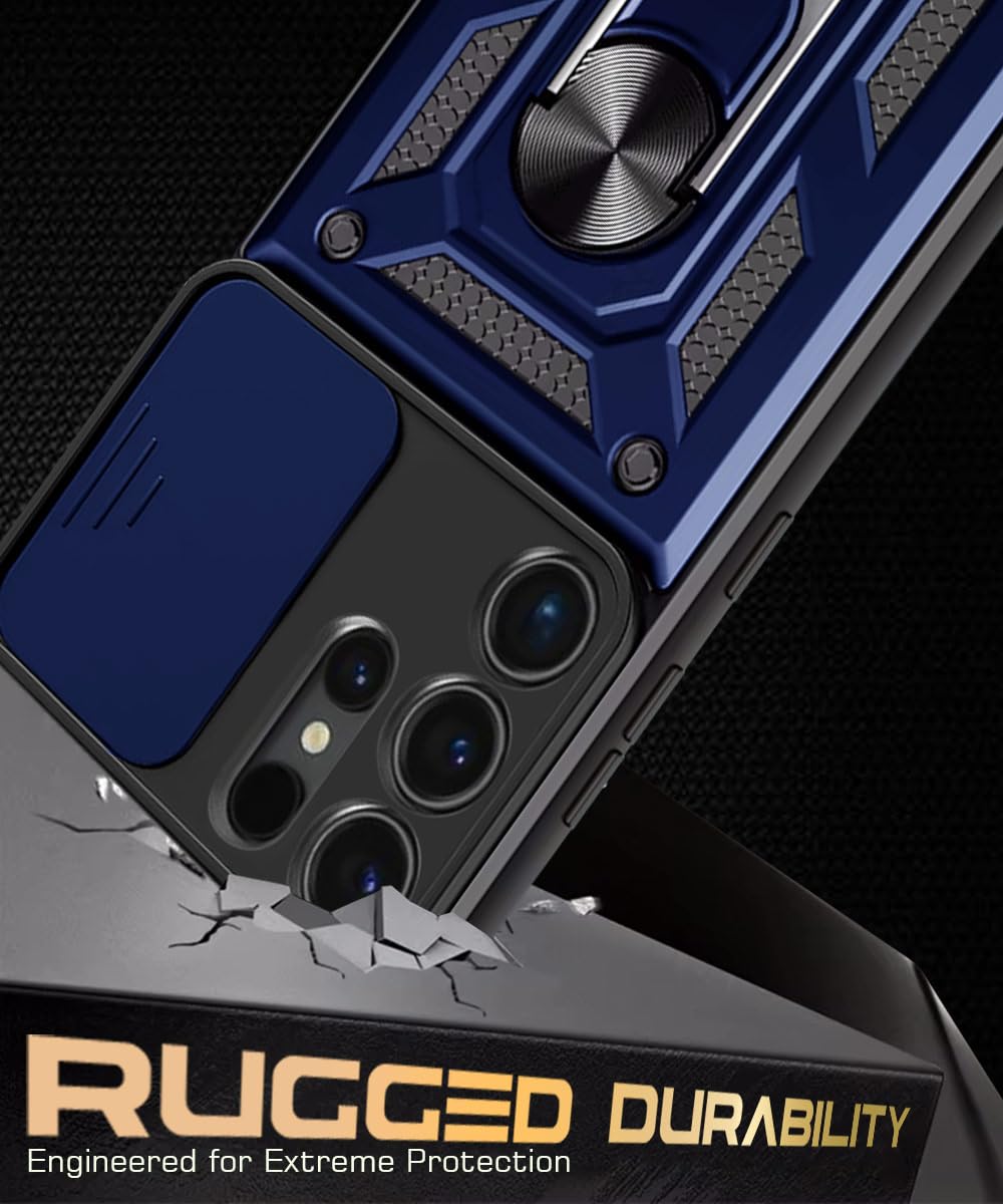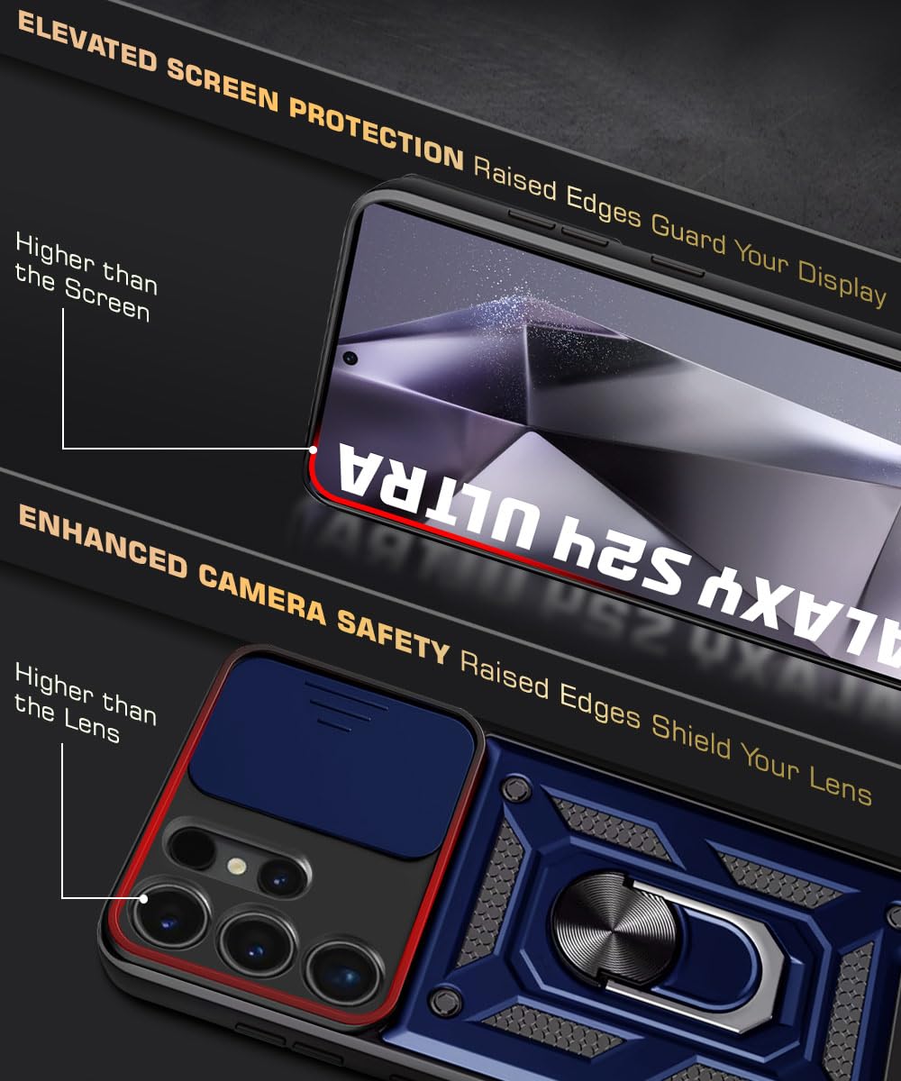 Tough Armor Bumper Mobile Back Case for Samsung Galaxy S24 Ultra 5G | Sliding Camera Shield Cover | Shock Proof 360? Protection | Hybrid PC + TPU | Ring Holder with Kickstand Blue is designed with premium quality materials to provide superior protection, durability, and style for your smartphone. It offers a perfect balance between functionality and aesthetics, ensuring your device stays safe from scratches, impacts, and daily wear. Engineered with precision, it features accurate cutouts for ports, buttons, and cameras, making it highly convenient for everyday use. The slim and lightweight design ensures that your device retains its sleek profile without adding unnecessary bulk. Whether it is a nano film tempered glass, a hybrid back case, or a camera lens protector, each product is created with attention to detail to enhance the user experience and extend the life of your smartphone. The material used ensures longlasting clarity, antiscratch performance, and resistance against fingerprints and smudges. It is the ideal choice for users who want both style and substance in their smartphone accessories. This product from reflects innovation and craftsmanship, making it a reliable accessory that safeguards your investment while maintaining modern appeal.
