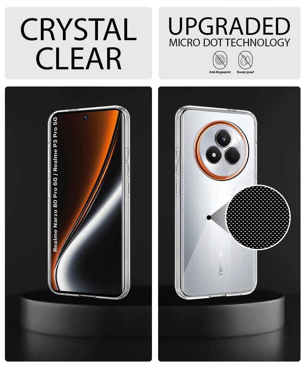 The Transparent Back Cover Case for Realme Narzo 80 Pro 5G | Raised Bumps for Full Device & Camera Protection Shockproof TPU Silicone Back Case Mobile Cover ? Transparent is designed with premium quality materials to provide superior protection, durability, and style for your smartphone. It offers a perfect balance between functionality and aesthetics, ensuring your device stays safe from scratches, impacts, and daily wear. Engineered with precision, it features accurate cutouts for ports, buttons, and cameras, making it highly convenient for everyday use. The slim and lightweight design ensures that your device retains its sleek profile without adding unnecessary bulk. Whether it is a nano film tempered glass, a hybrid back case, or a camera lens protector, each product is created with attention to detail to enhance the user experience and extend the life of your smartphone. The material used ensures long-lasting clarity, anti-scratch performance, and resistance against fingerprints and smudges. It is the ideal choice for users who want both style and substance in their smartphone accessories. This product from reflects innovation and craftsmanship, making it a reliable accessory that safeguards your investment while maintaining modern appeal.