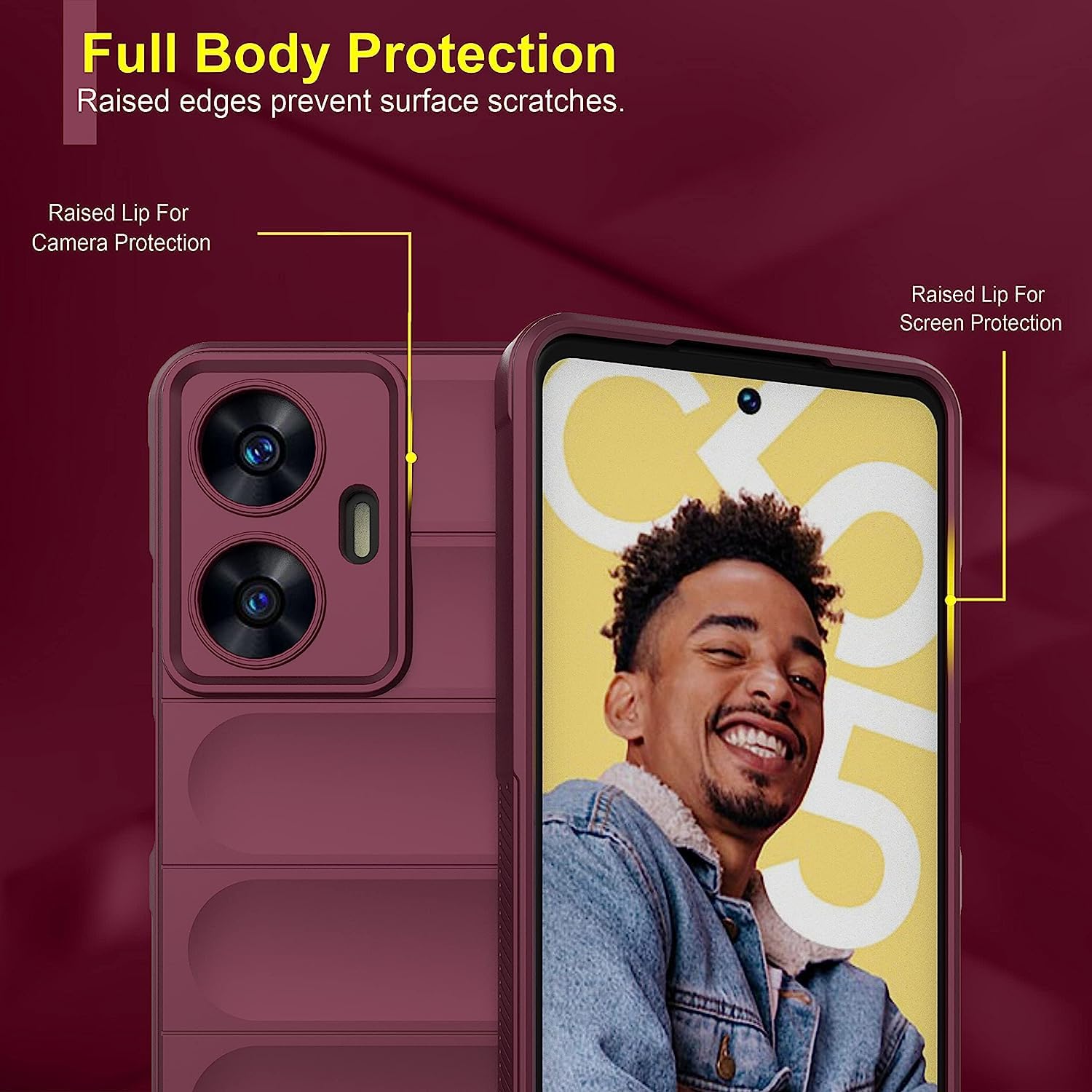 The Ultimate Silicon Back Cover Case for Realme Narzo N55| C55 | Military Grade Drop Protection Shockproof Bumper | Anti-Slip Grip | Scratch Proof Micro-Fibre Cloth Inside (Crimson Red) is designed with premium quality materials to provide superior protection, durability, and style for your smartphone. It offers a perfect balance between functionality and aesthetics, ensuring your device stays safe from scratches, impacts, and daily wear. Engineered with precision, it features accurate cutouts for ports, buttons, and cameras, making it highly convenient for everyday use. The slim and lightweight design ensures that your device retains its sleek profile without adding unnecessary bulk. Whether it is a nano film tempered glass, a hybrid back case, or a camera lens protector, each product is created with attention to detail to enhance the user experience and extend the life of your smartphone. The material used ensures long-lasting clarity, anti-scratch performance, and resistance against fingerprints and smudges. It is the ideal choice for users who want both style and substance in their smartphone accessories. This product from reflects innovation and craftsmanship, making it a reliable accessory that safeguards your investment while maintaining modern appeal.