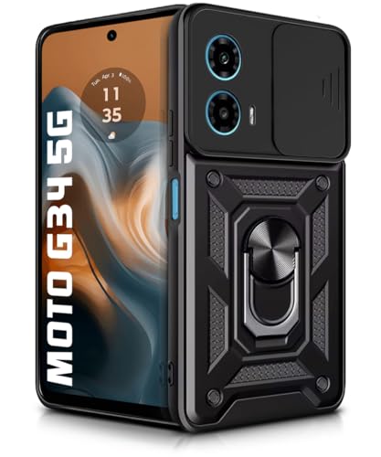Tough Armor Bumper Mobile Back Case for Motorola Moto G34 5G | Moto G45 5G | Sliding Camera Shield Cover | Shockproof 360? Protection | Hybrid PC + TPU | Ring Holder with Kickstand ? Black