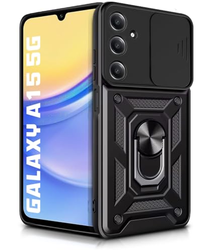 Tough Armor Bumper Mobile Back Case for Samsung Galaxy A15 5G | Sliding Camera Shield Cover | Shock Proof 360? Protection | Hybrid PC + TPU | Ring Holder with Kickstand ? Black