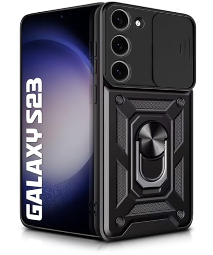 Tough Armor Bumper Mobile Back Case for Samsung Galaxy S23 5G | Sliding Camera Shield Cover | Shock Proof 360? Protection | Hybrid PC + TPU | Ring Holder with Kickstand ? Black